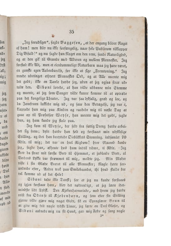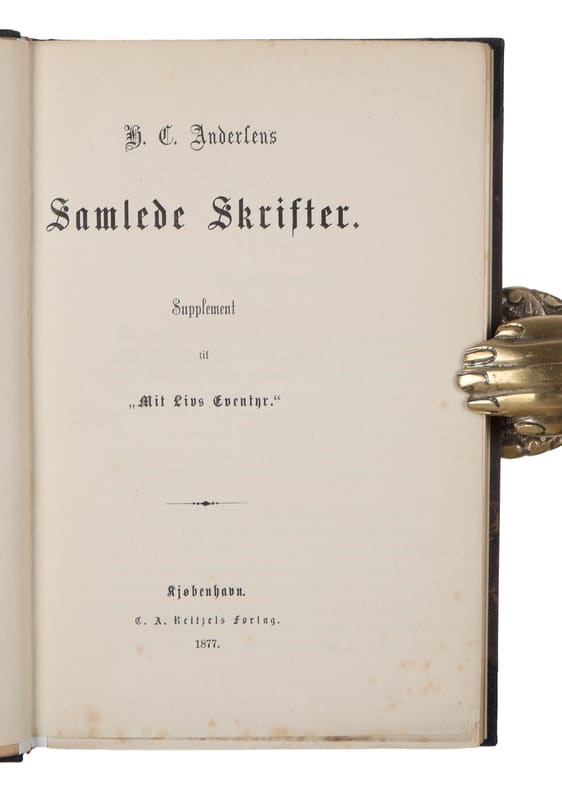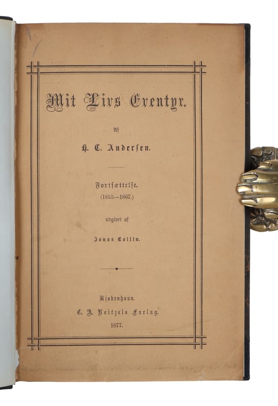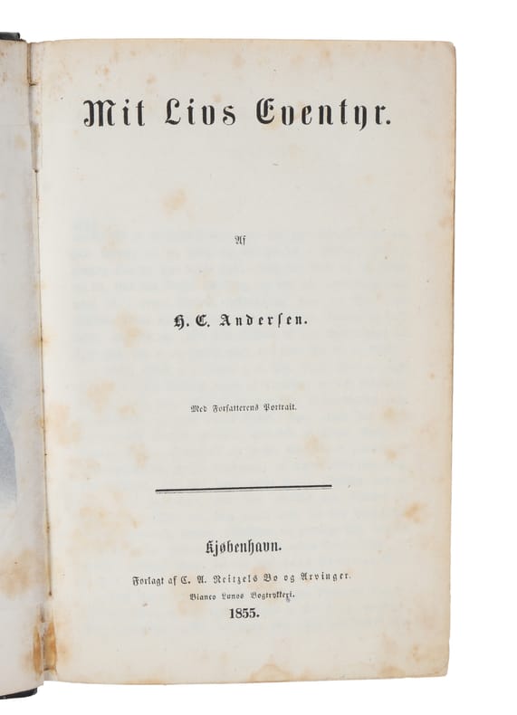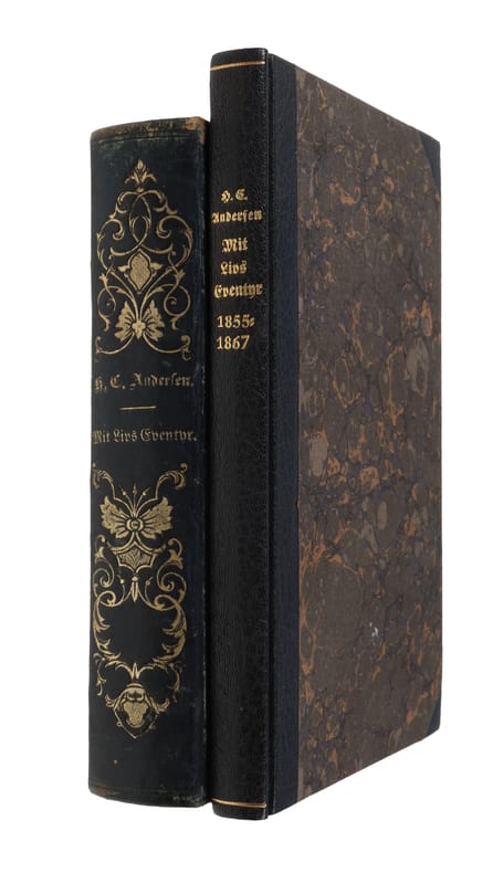 K., 1855. + Mit Livs Eventyr. Fortsættelse (1855 - 1867). K., 1877. Bd. 1 i smukt samt. hldrbd. m. rig rygforgyldn. Bd. 2 indb. ubeskåret m. orig. for- og bagomsl. samt omsl.s ryg i nydeligt nyere hldrbd. af blå-grå maroquin. Med litograferet Portræt. Her og der lidt brunplettet.