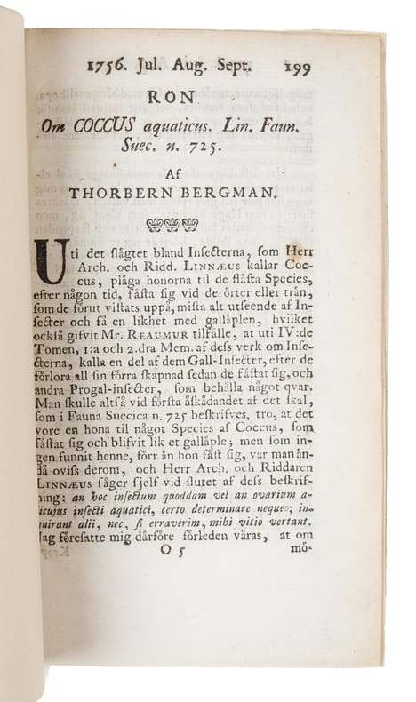 (Stockholm, 1756). Nyere marmoreret omslag. pp. 199-204. Udtog af Kongl. Vetenskaps Academiens Handlingar Jul. Aug. Sept. 1756.