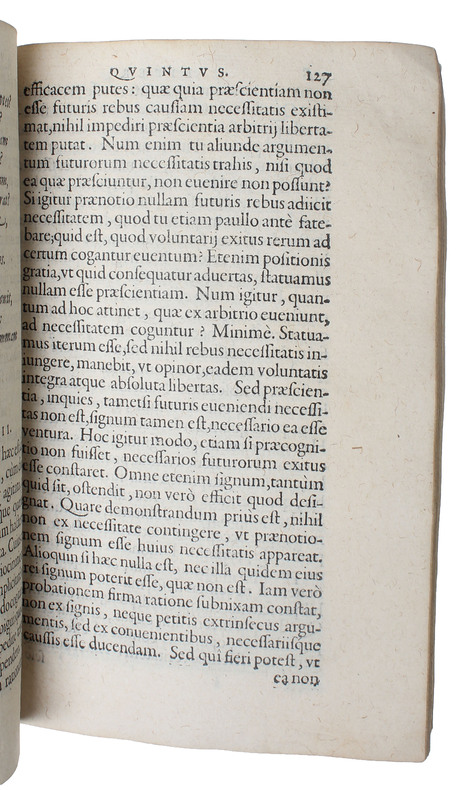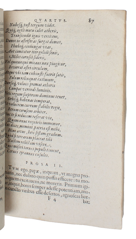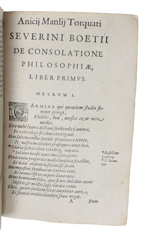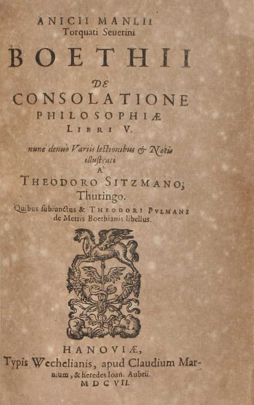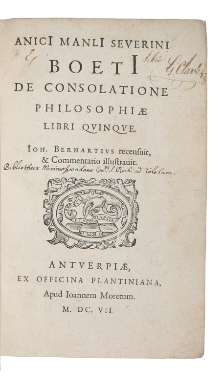 First editions, both published in the same year, of two highly esteemed commented editions of Boethius' seminal ""The Consolation of Philosophy"", which together make up an important contribution to Boethius-scholarship and the understanding of this most central text of both Antiquity, Christianity, and the Middle Ages. In fact, the collection of the two present editions, collected and bound at the time of their appearance, almost constitute a singular pre-edition of the famous and important so-called ""Variorum Boethius"", which appeared more than 60 years later, in 1671, and unites the commentaries and notes of Bernartius and Sitzmann. The 1671 edition, which was printed in Leiden, became very popular. According to Dibdin, ""The first edition is a very good one, and is emphatically styled, ""the Variorum Boethius.""... The notes, chiefly by Sitzmanus and Bernartius, are numerous and pertinent."" (II:352-53).The beautiful and elegant Plantin-edition constitutes one of the most important commented editions of Boethius' work. It is renowned for Bernartius' excellent and extensive commentaries and the correctness of the text.The Marnius-edition is of great value due to the learned commentaries and notes by Sitzmann, which include an apparatus of classical and post-classical sources.It is of great interest to see the two works collected in this manner, many decades before the commentaries by the two renowned scholars were collected officially and printed together. Apart from the difference in notes and commentaries, the two works complement each other in other respects as well, contributing to the value of having them together. For instance, the Plantin-edition contains Julianus Martianus Rota's ""Life of Boethius"", whereas the Marnius-edition contains Theodore Peolman's foudational study on Boethian metre and verse.As such, the present book unites two works of the most excellent complimentary value, greatly contributing to the understanding of one of the most important, influential, widely discussed and studied works of Antiquity and the Middle Ages. As a philosopher Boethius (480 - ca. 525) stands tall in the middle between Antiquity and the Middle Ages. Time-wise he clearly belongs to late Antiquity, but he is a Christian and he writes in Latin. Still being a Christian, he also comes to represent the actual centre of a tradition that goes directly back to Plotinus and thereby indirectly back to Plato and Aristotle. Boethius was imprisoned and later executed, accused of treason against the gothic regime as well as of sorcery, though he himself claims that it was caused by his political activity, where he as a court official defended the weak" caused by his uprightness, his enemies were too many. The most plausible explanation is that Theoderic doubted the loyalty of the Roman aristocracy and thereby especially the frank Boethius. While in prison, Boethius wrote this his main work, which is without a doubt the most widely read, commented and influential of his works. The work is atypical for the time and is written as a philosophical conversation between Boethius himself and the goddess of Philosophy. Though always a Christian, in this work he is first and foremost a philosopher, which is why there are many allusions to pagan neo-platonism, however during the Middle Ages all passages of this work were very popularly interpreted in accordance with Christianity. Few people have been of so seminal character to medieval philosophy and religion as Boethius" perhaps only Aristotle himself and Augustine were more influential and important. Few books were so widely read during the Middle Ages as the Consolation of Philosophy, and virtually no book has been as major a source of ancient philosophy in the early Middle Ages as this one. As well of being of great textbook value this work has inspired and influenced numerous religious, philosophical and literary writers. ""For some writers, such as the Middle English poet, Chauser, the ""Consolation"" seems to have provided a model for writing about serious issues in a way which presupposes no commitment to Christianity, a philosophical precedent for the use of pagan setting in a literary fiction."" (John Marenbon, Medieval Philosophy, 1998, p. 24).With the death of Boethius came also the end of ancient tradition of philosophy in the Latin West, though through his writings, the influence of this philosophical tradition was preserved during the Middle Ages and through to the Renaissance and early modern times. Dibdin II: 352-353.