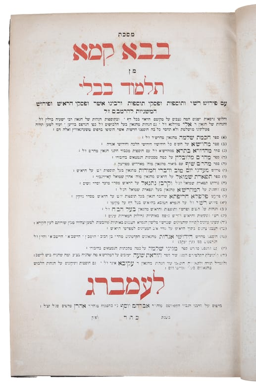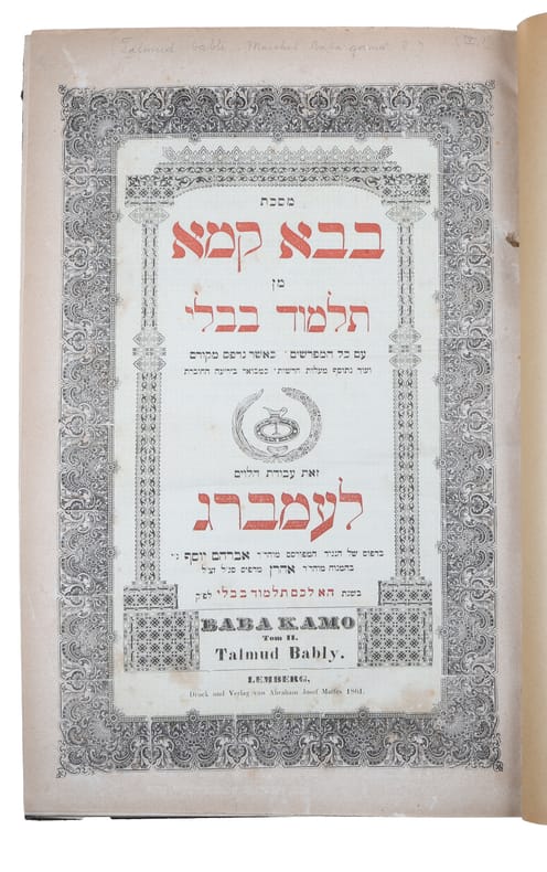 Lemberg, Druck und Verlag von Abraham Josef Matfes, 1861. Folio. Contemporary half cloth. (356) pp. Title printed in red and black.