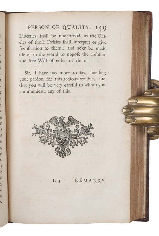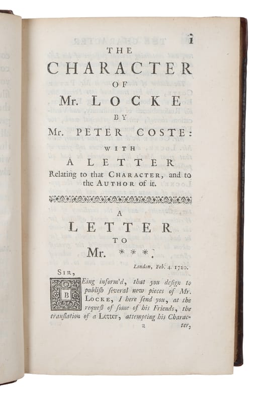 First edition of this important collection of hitherto unpublished works by Locke, containing the first printing of his unique work on Natural philosophy ""The Elements of Natural Philosophy"" as well as first printings of other important works. Assisted by Anthony Collins, in 1720 the journalist Pierre Desmaizeaux brought out a new collection of Works and pieces by John Locke that had not previously been published. This collection, ""A Collection of Several Pieces"", came to play a great role in the Locke scholarship, not least in recent times, and not least because it contains the first printing of his ""Elements of Natural Philosophy""The ""Elements of Natural Philosophy"" constitutes Locke's main work in natural philosophy, and it is a work that pas puzzled Locke scholars and readers ever since its appearance. The work seems to need some further explanation"" at a firsthand glance it doesn't look very much like Locke - the greatest of the English philosophers who has so frequently been accused of not understanding the exact sciences and who even encouraged the youth not to learn these but to educate themselves in superficial and useful party-conversation. Thus, numerous attempts have been made to establish the influence that resulted in this educational work of natural science. The two dominating answers to the question of influence are now: Newton and Descartes. It now seems to be fairly commonly recognized that Newton, a personal friend of Locke, even contributed directly to the work. ""When Locke himself at the end of his life came to compose a treatise on natural philosophy for a pupil, we have reason to believe that he obtained the advice and help of the most brilliant scientist of the century, his close friend Isaac Newton. As we shall see, this unique educational work itself, ""The Elements of Natural Philosophy"", belies the myth of Locke the scientific smatterer."" (Axtell, Locke, Newton, and the Elements of Natural Philosophy, p. 244). However, Descartes influence also seems to be obvious"" ""The influence of the ""Principles"" (by Descartes) is also obvious in Locke's posthumously published ""Elements of Natural Philosophy"". There is a striking similarity in the order of exposition, although there are also considerable differences: Locke carefully eschewed Descartes' ""a priori"" metahpysics of nature... We find him rather emphasizing the essential role of experience. For example, Locke introduced Newtonian universal gravitation as follows:... Thus, according to Locke empirical support was necessary to establish the law of nature. Although the exposition looks quite similar to Descartes' ""Principles"", the ""Elements"" in fact contain several anti-Cartesian remarks in favour of the experimental philosophy."" (Aoki, Descartes and Locke on the Nature of Matter. In: Hutton and Schuurmann edt., Studies on Locke, p. 77).""Elements of Natural Philosophy"" was printed in no less than nine times during the 1th century and appeared in both Russian and French during the 18th century as well.The present ""Collection of several Pieces"" furthermore included a collection of letters from Locke to Anthony Collins, ""Remarks upon some of Mr. Norris's Books..."", ""Some Thoughts concerning Reading and Study for a Gentleman..."", and ""Rules of a society..."", all printed here for the first time, as well as an English translation of Coste's Eulogy (""The Character of Mr. Locke"", originally published in French in 1705), and reprints of ""The fundamental Constitutions of Carolina"" and ""A Letter from a person of Quality..."".""Remarks upon some of Mr. Norris's books..."" is the third of Locke's replies to Norris. ""Some thoughts concerning reading and study for a gentleman"" constitutes Locke's reply to Samuel Bold's question, on behalf of a parishioner, on how to create a course of reading and study. ""Rules of a Society"" constitutes the rules that Locke set up for a small group of friends who met once a week to discuss ""useful Knowledge"" and to promote ""Truth and Christian Charity"". Throughout his life Locke created several of these ""societies"", one of which led to his ""An Essay Concerning Human Understanding"", another one being ""The College"" in London after the Revolution.