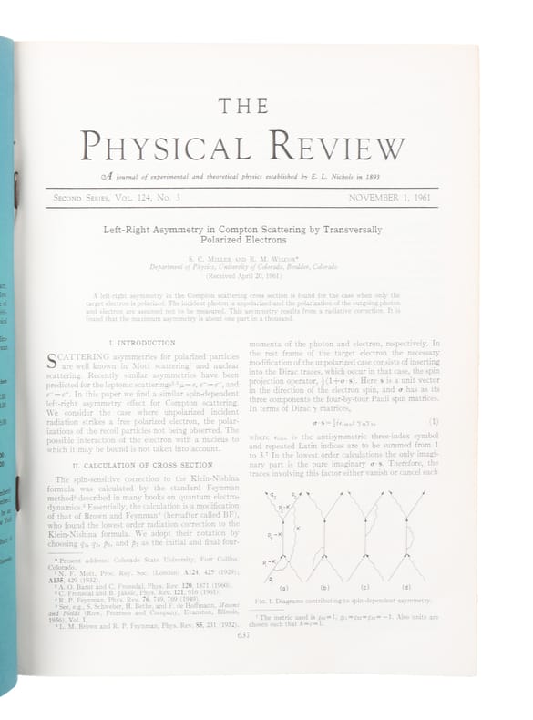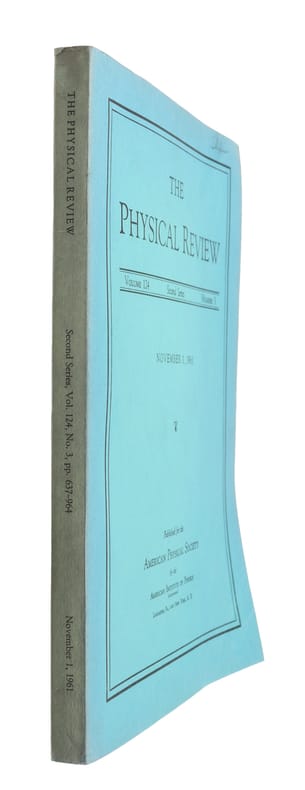 Lancaster, American Institute of Physics, 1961. Lex8vo. Volume 124, November 1, No. 3, 1961 of ""The Physical Review"", Second Series. Entire volume offered. In the original printed blue wrappers. Minor discolouring to wrappers, and bottom corner of front wrapper slightly bent. Previous owner's name to top right corner of front wrapper. Overall a very nice and clean copy. Pp. 925-939. [Entire issue: Pp. 637-964].
