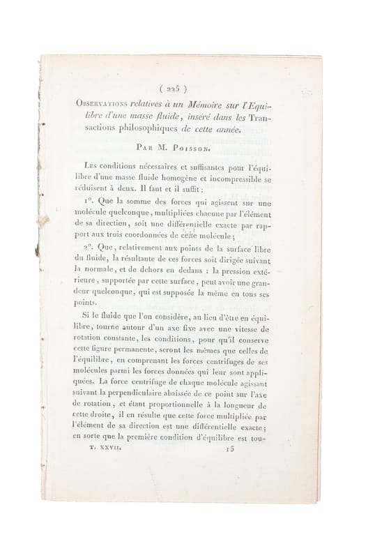 First printing of this importent paper dealing with the ""Green-House-Effect"". It is the second paper from 1824 in which Fourier investigates the connection between the temperature of the earth and radiation. Fourier's analysis in these two papers is widely recognized as the first proposal of what is now known as the greenhouse effect theory.In the 1820s Fourier calculated that an object the size of the Earth and at its distance from the Sun should be considerably colder than the planet actually is if warmed only by the effects of incoming solar radiation. He examined various possible sources of the additional observed heat in articles published in 1824 (the paper offered is the second of the papers published 1824) and 1827. While he ultimately suggested that interstellar radiation might be responsible for a large portion of the additional warmth, Fourier's consideration of the possibility that the Earth's atmosphere might act as an insulator of some kind is widely recognized as the first proposal of what is now known as the greenhouse effect theory.