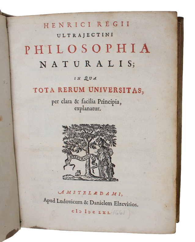 Amsterdam, L. & D. Elzevirios, 1661. 4to. Contemp. full vellum, ms-title on spine. Title in red/black. Engraved portrai of Regius on verso of f 4 (H. Bloemaert pinxit, T. Matha, sculpsit). (44),523,(1- Errata) pp. 2 folded engraved plates (Globus Coelestis a. Orbis Terrarum Typus). Numerous woodcut illustrations in the text, astronomical, mechanical, physical, physiological, anatomical, theory of light, theory of vision etc. etc. Printed on good paper, clean and fine.