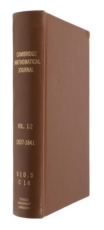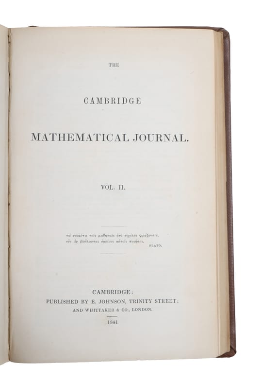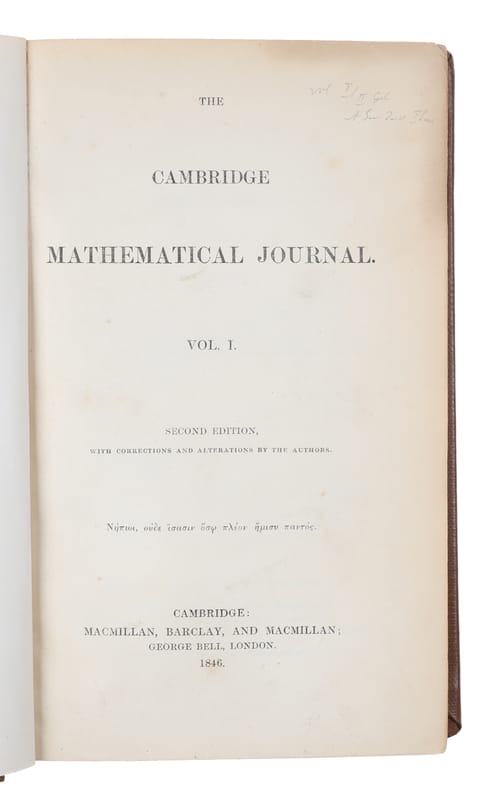 Cambridge, Macmillan, Barclay, and Macmillan, 1840-1846. 8vo. Bound in recent brown full cloth with gilt letting to spine. In ""The Cambridge Mathematical Journal, Vol. 1-2, Second edition"". Light writing in pencil to title page and very light miscolouring to borders of pages, otherwise a fine and clean copy. VI, 311, (1), VIII, (2), II, 284 pp. + folded plates.