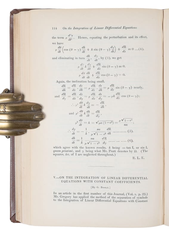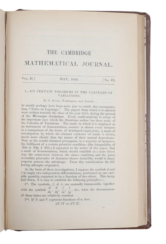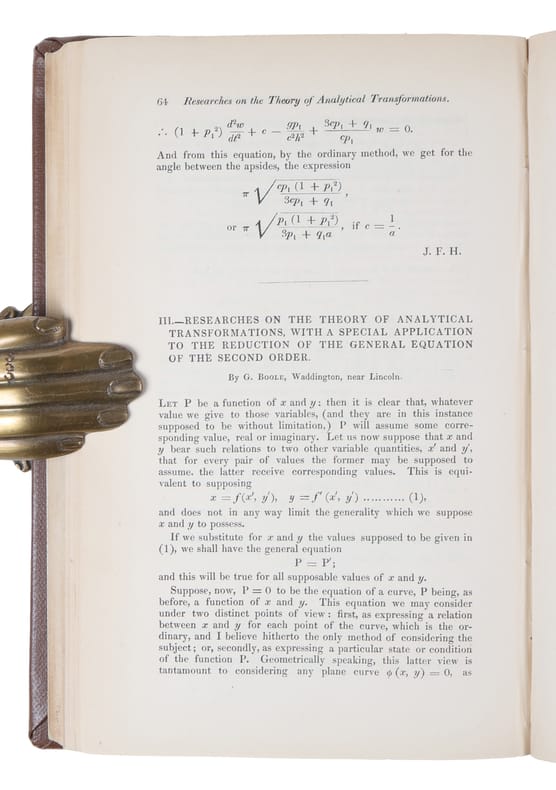 First printing of four early papers by the influential British mathematician and philosopher. As the inventor of Boolean logic-the basis of modern digital computer logic-Boole is regarded in hindsight as a founder of the field of computer science. His earliest published paper was the ""Researches in the theory of analytical transformations, with a special application to the reduction of the general equation of the second order."" Printed in the Cambridge Mathematical Journal in February 1840 (Volume 2, no. 8, pp. 64-73), and it led to a friendship between Boole and D.F. Gregory, the editor of the journal, which lasted until the death of the latter in 1844.In 1840 he began to contribute to the recently founded Cambridge Mathematical Journal and also to the Royal Society, which awarded him a Royal Medal in 1844 for his papers on operators in analysis"" he was elected a fellow of the Royal Society in 1857.""In papers in the Cambridge Mathematical Journal in 1841 and 1843 [The present], Boole dealt with linear transformations. The algebraic fact had been partly perceived by Lagrange and by Gauss, but Boole's argument drew attention to the (relative) invariance of the discrimiant ab - h2, and also to the absolute invariants of the transformation. This was the starting point of the theory of invariants, so rapidly and extensively developed in the second half of the nineteenth century."" (DSB)