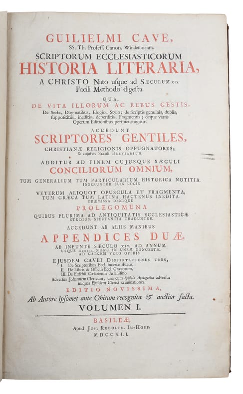 The main work of the noted English church historian, being the histroy of the most eminent Fathers of the Church. The work was first published in 1683. - ""... a valuable work, displaying great reading, research and accuracy, superintended by Dr. Waterland."" (Lowndes I:395).