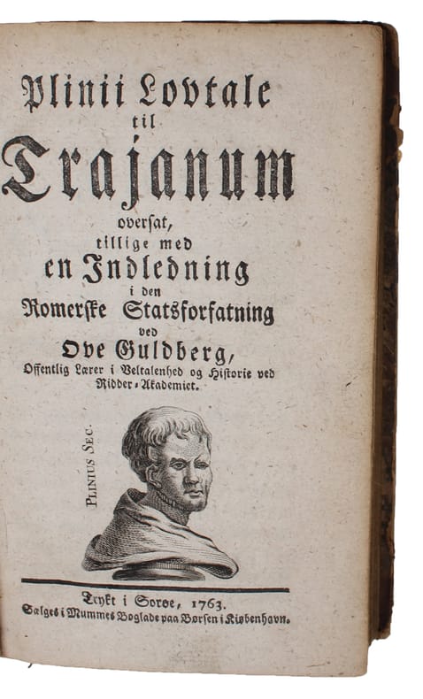 Originaltrykket af Guldbergs Plinius-oversættelse samt hans store afhandling om den Romerske Statsforfatning. Bogen blev til under Guldbergs tid som lærer ved Sorø Akademi.Bibl. Danica IV:130.