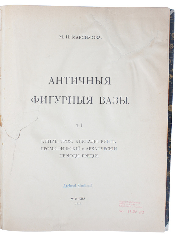 Moskau, 1916. Large 4to. Contemp. hcloth. VI,146 pp., 24 plates with 175 figs. (collotype). Titlepage repaired for 2 tears, otherwise interbally fine. Text throughout in Russian.