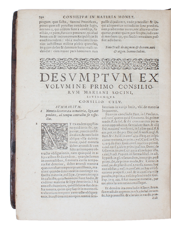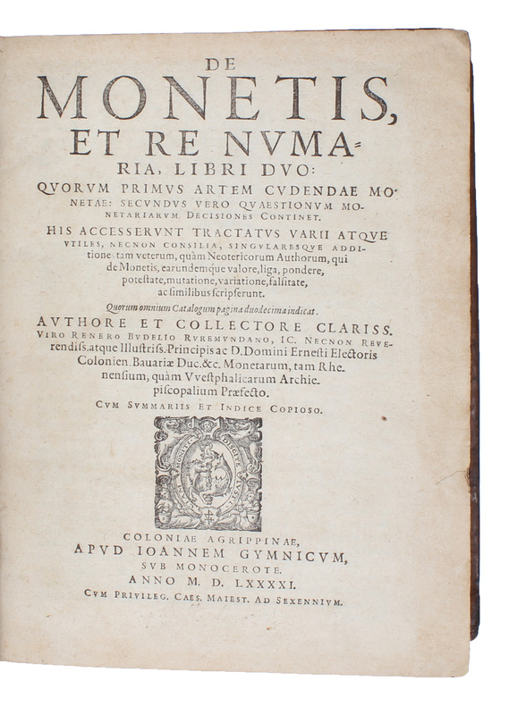 Scarce first edition of one of the earliest - and most important - works on coinage, dealing with weight and measure, as well as the value and devaluation of money. Apart from the seminal original contribution of Budel, this extensive work contains 29 contributions by earlier philosophers and theologians on the subject, - ""a compilation of almost every earlier treatise on the subject"" - which, in a true Renaissance spirit, makes it the very first compilation in economic history."" ""De Monetis et re numaria"" remained the standard work on the subject for almost two centuries"". (Nussbaum, A Note on the Idea of World Money). During the Renaissance, international banking saw a rise, which eventually resulted in a demand for one uniform European coinage. Budelius' thesis can be read as an ideological response to this demand, as he argued for precisely that: a unified market with one universal coinage. In this sense, his work anticipates by several hundred years many of the economic thoughts presented by the Classical economists during the second half of 18th century. Budelius discusses the metallic view and the abuse of adulteration and falsification, and then attempts an exposition of how money may be coined in the most practical way. He then goes on to deal with the problem of how a debtor will meet his obligations if the coinage has been debased since the time the debt was contacted or the loan received. He maintaind that the same bullion value must be repaid although the coin may be depreciated - a view that was generally accepted at the time.The third part of the work consists of a ""compilation of almost every earlier treatise on the subject. In nearly all of them, the central problem is the same as the one discussed in the second book of Budelius' work"". (Mariana ,The political economy of Juan de Mariana).The general thesis of Budelius' work is that the trading partners should seek to use only one currency and that the law of coinage and money's ""natural state"" (an early reference to how money behave in the market) should be unified. In the period of the Cologne War, Germany had several different currencies and laws in relation to coinage and minting of coins. This not only restrained the domestic trade in Germany, it also lead to armed conflict which again resulted in a more fragmented economy. Budelius's work can be read as an attempt to unify Germany (and the rest of Europe) under one currency, which also would serve the purpose of stabilizing the highly volatile curriencies during this period: ""The widely cited Rene Budel (1591) held it ""to be indubitable that a Prince in the midst of costly wars, and therefore in great necessity, can order that money be made out of leather, bark, salt, or any material he wants, if he is careful to repair the loss inflicted thereby on the community with good and better money"". (Cambridge Companion to Economic Thought). In the sense of unifying Europe under one currency, Budelius seperates himself from not only Medieval monetary thinkers, but from his contemporary mercantilists as well: ""The medieval literature on money is characterized by nascent nationalism, with the imagery of the body applied to the kingdom, and of money as the blood moving through its parts. Nicole Oresme’s De Moneta pointed out that if money is accumulated in the king’s treasury and withdrawn from circulation, it constitutes an abscess in the body."" (Cambridge Companion to Economic Thought). His comments represent the synthesis of two traditions, one uncovering the theoretical possibility of fiat money, the other uncovering its practical usefulness, as means of raising revenues in emergencies, from examples taken from history. Budelius cites examples of copper petty coinage in Germany and the Low countries, and gives examples of siege money. From Maastricht in 1579 (copper), Vienna in 1529 (lead), tin in Neuss, and even paper siege money in Leyden in 1574. He then writes: ""I hold this to be indubitable, as I recall a little earlier, that a Prince in the midst of costly wars, and therefore in great necessity, can order that money be made out of leather, bark, salt, or any material he wants, if he is careful to repair the loss inflicted thereby on the community with good and better money."" The insights of Budel about token money were to be tested by some experiments in the coming years and were carried further by important theorists in the Renaissance and later. Budelius (1530-91), was a practitioner, a jurist by training, who worked as diplomat for the archbishop of Cologne, and later as mint-master in Westphalia for the duke of Bavaria. This is reflected in his practical and empirical approach to the economic challenges the Renaissance society was subjected to, unlike the more often seen theoretical and moral approach. Goldsmith 254Mattioli 451 Einaudi 737 Adams 3153"" Smith, Rara Arithmetica 396: ""A monumental work"".