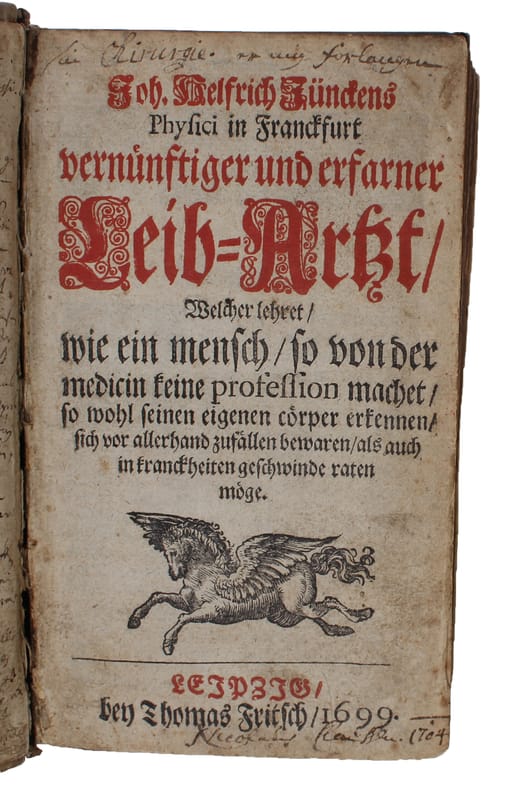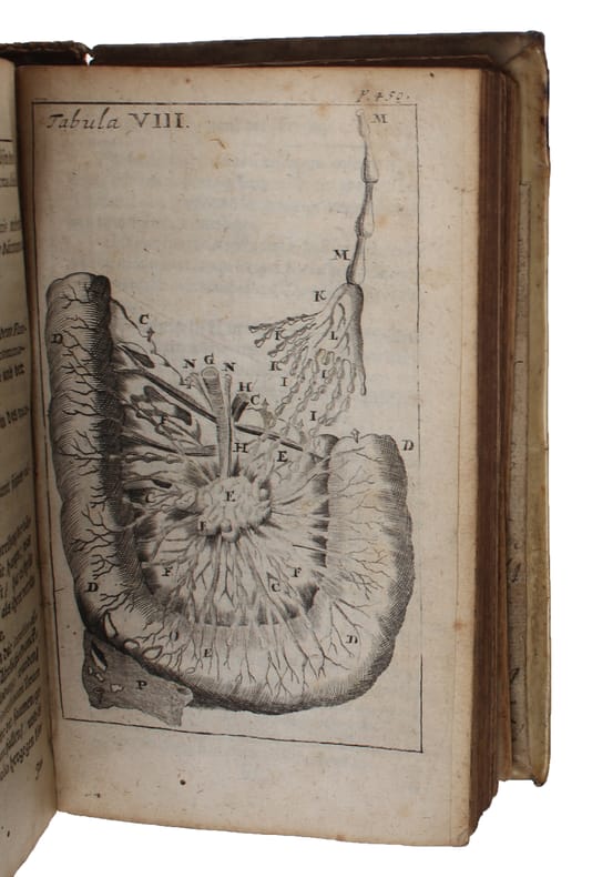 Leipzig, Thomas Fritsch, 1699. 8vo. Contemp. full vellum. A bit of discolouring to spine and covers. Free endpaper lacks. Title-page in red/black. (2),742,(24) pp. and 14 engraved plates (numb. I-XIII a. I bis). 2 of the plates depicts the brain. Occasionally light browning. A few old annotations.