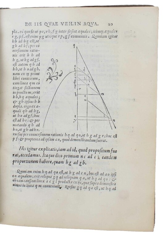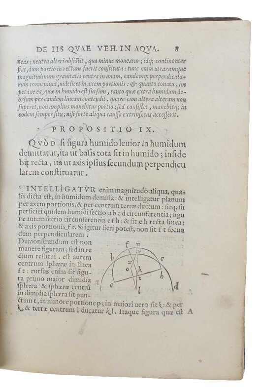 First edition of Commandino's translation, and accompanying mathematical additions, of Archimedes' work on floating bodies, being the foundational work of hydrostatics. Commandino's own mathematical additions include the very first attempt to fill the gap in the incomplete proof of propositions 2 in book II of the Latin translation made by the Flemish Willem Moerbeke in 1269. ""This edition of Commandino remained the reference until the early twentieth century and the work of Heiberg after the discovery of the Archimedes palimpsest"". (D.B.I).""In hydrostatics [Archimedes] described the equilibrium of floating bodies and stated the famous proposition - known by his name - that, if a solid floats in a fluid, the weight of the solid is equal to that of the fluid displaced and, if a solid heavier than a fluid is weighed in it, it will be lighter than its true weight by the weight of the fluid displaced. We owe to Archimedes the full exposition of the doctrine of levers and pulleys."" (PMM, p. 44)The work consists of two parts: The first is to the effect that the pressure excerted by any part of a fluid on the fluid is downward. The second postulate states that the pressure of the fluid on a body placed in it is exerted upward along the perpendicular through the center of the body.However, Book II contained many sophisticated ideas and complex geometric constructions and did not have the appeal of Book I. Only after Greek geometry was combined with algebra, trigonometry, and analytical geometry, the present work being one of the earliest attempts to do this, and the field of mechanics reached the maturity to handle the concepts of equilibrium and stability that Archimedes introduced was Book II seriously studied. It then became the standard starting point for scientists and naval architects examining the stability of ships and other floating bodies.""Archimedes left to posterity his famous treatise ""On Floating Bodies"", which establishes the physical foundations for the floatability and stability of ships and other maritime objects. Yet since this treatise was long lost and also simply ignored by practitioners, it took many centuries before Archimedes' brilliant insights were actually applied in ship design and ship safety assessment."" (Nowacki, The Heritage of Archimedes in Ship Hydrostatics: 2000 Years from Theories to Applications).A Greek manuscript dating from about the ninth century and containing both books of On Floating Bodies was translated into Latin by the Flemish Dominican William of Moerbeke in 1269, along with other works of Archimedes from other manuscripts. The tracks of the Greek manuscript were lost in the fourteenth century, but Moerbeke's holograph remains intact in the Vatican library (Codex Ottobonianus Latinus 1850) [5, 8]. Moerbeke's Latin translation was the source of all versions of On Floating Bodies from his time until the twentieth century.""In 1543 Tartaglia [...] the Moerbeke translations of On the Equilibrium of Planes and Book I of On Floating Bodies (leaving the erroneous impression that he had made these translations from a Greek manuscript, which he had not since he merely repeated the texts of the Madrid manuscript with virtually all their errors). Incidentally, Curtius Trioianus published from the legacy of Tartaglia both books of On Floating Bodies in Moerbeke's translation (Venice, 1565). The key event, however, in the further spread of Archimedes was the aforementioned editio princeps of the Greek text with the accompanying Latin translation of James of Cremona at Basel in 1544. Since the Greek text rested ultimately on manuscript A,On Floating Bodies was not included. A further Latin translation of the Archimedean texts was published by the perceptive mathematician Federigo Commandino [...], which the translator supplemented with a skillful mathematical emendation of Moerbeke's translation of On Floating Bodies (Bologna,1565) but without any knowledge of the long lost Greek text."" (DSB)Adams, 1533 Riccardi, I, 42- 5Honeyman 131" Macclesfield 183D.B.I., XXVII, p. 604.Bibliotheca Mechanica 78Graesse I, 180.BM 000105842