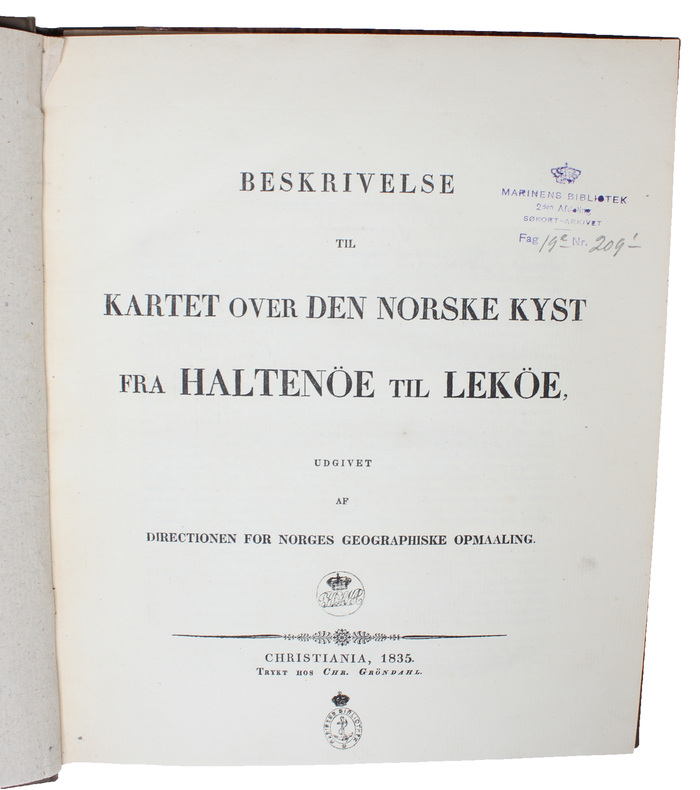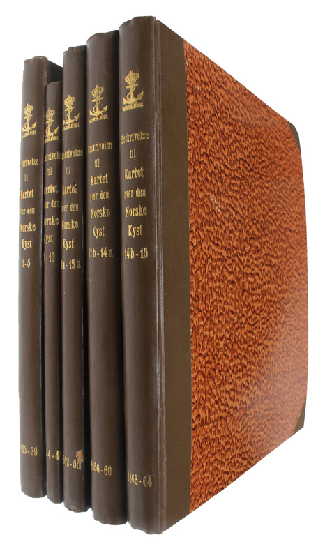 Disse kortbeskrivelser er forløberne for ""Den Norske Los"". Omfatter: 1. Fra Haltenöe til Leköe. 1835. VIII,18 pp. - 2. Fra Leköe til Dönnaesöe. 1836. 19 pp. - 3. Fra Dnnarsöe til Fleina og Sandhornet. 1837. 18 pp. - 4. Fra Fleina og Sandhornet til Tranö med den sydlige Deel af Lofoten... 1839. 27 pp. samt 1 foldeplanche (landtoninger). - 5. Fra Tranö til Gisund. 1841. 28 pp. samt 1 foldeplanche (landtoninger). - 6. Fra Andö til Gisund. 1842. 23 pp. samt foldeplanche (landtoninger). - 7. Fra Kvalö og Grötsund til Söröen. 1844. 19 pp. samt foldeplanche (landtoninger). - 8. Fra Söröen til Nordkap. 1845. 14 pp. samt foldeplanche (landtoninger). - 9. Fra Nordkap til Tanahorn. 1847. 11 pp. - 10. Fra Tanahorn til grændsen mod Russisk Lapland. 1848. 11 pp. - 11a. Fra Christiania til Tönsberg, Torgersö Fyr og Rauö. 1852. 17 pp. - 11b. Fra Rauö til Idefjorden med den tilgrændsende Kyst. 1852. 14 pp. samt foldeplanche (landtoninger). - 11c. Fra Tönsberg og Torgersö Fyr til Jomfruland. 1853. 23 pp. samt foldeplanche (landtoninger). - 12a. Fra Jomfruland og Kragerö til Arendal. 1855. 36 pp. samt foldeplanche (landtoninger). - 12b. Fra Arendal til Christiansand. 1856. 67 pp. samt foldeplanche (landtoninger). - 13a. Fra Christiansand til Lindesnæs. 1857. 57 pp. samt foldeplanche (landtoninger). - 13b. Fra Ekersund til Lindesnæs. 1858. 36 pp. samt foldeplanche (landtoninger). - 14a. Fra Hvidingsö og Stavanger til Ekersund. 1860. 66 pp. samt 2 foldeplancher (landtoninger). - 14b. Fra Espevær ved Bömmelö til Hvidingsö og Byfjorden ved Stavanger. 1863. 126 pp. samt foldeplanche (landtoninger). - 15. Fra Espevær ved Bommelö til Korsfjord. 1864. 56 pp. samt foldeplanche (landtoninger).