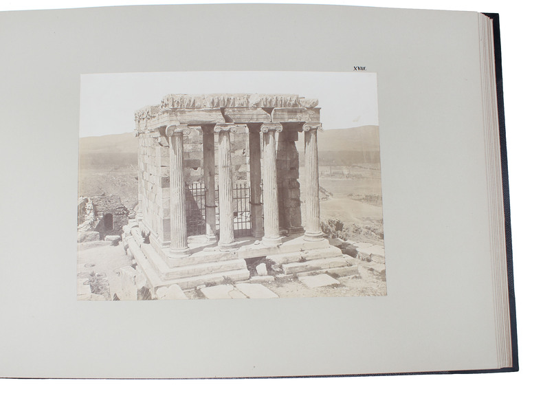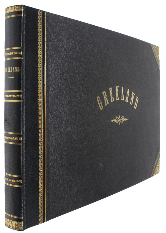[Circa 1870-1880]. A series of 17 unsigned photographs of ancient Greek monuments, temples and artworks, most measuring 25 x 17 cm, some slightly smaller, some slightly larger, all mounted on leaves measuring 30x42 cm. and bound in an exquisite near contemporary (ab. 1900) oblong black half morocco binding with four raised bands, gilt spines, boards with elaborately gilt corners, gilt border and to the middle of front board a gilt vignette, gilt title (""Grekland"" i.e. Norwegian for Greece). Housed in an equally elegant half morocco boxes with with gilt spines, marbled edges, and with middle of boards corresponding to those of the binding. The box are also from ab. 1900. The box have a few traces of wear, but all in all, the set is in splendid condition.
