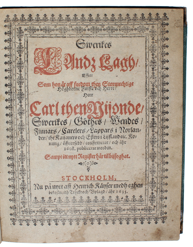 Second printing (the first being from 1634) of Sweden's Carl IX's state law. Collijn Sweden's bibliography 1600s: 483.Rudbeck 13