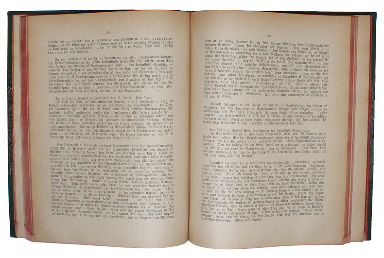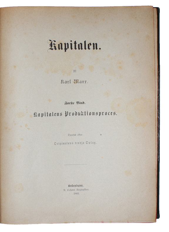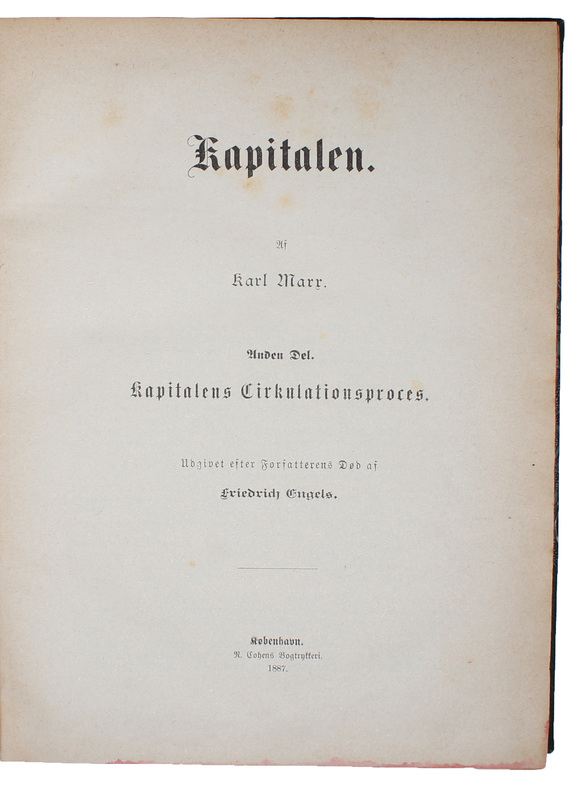 First edition of the first Danish translation of ""Das Kapital"". The translation is remarkable in several respects - the Danish Social-democratic party was one of the first labour organizations in the world to publish the two volumes of ""The Capital"", the translation of the first volume preceded both the English and the Italian, and the translation of the second volume is the second in the world to appear, only preceded by the Russian from 1885 - furthermore, these two translations were the only two to appear of volume two until after Engels' death in 1895. After having been in a serious crisis at the end of the 1870'ies, the labour movement in Denmark turned things around in the 1880'ies, primarily with the aid of Marx. Marx' theories and his connection between theoretical and practical politics became the foundation for the Social Democrats. In 1884, the Danish Social Democratic Party got its two first members of parliament elected, and many workers wished to become politically active. Also in Denmark, the class struggle had properly begun.As Marx was the foundation for the beginning success of the Social Democrats, the Party decided that it would translate and publish all the most important works by Marx - of course most importantly ""The Capital"". This translation was to become ""a new and powerful weapon for the Danish Labour Party in the agitation for the socialist principles"". The translation of ""The Capital"" was made by the linguist and journalist Hans Vilhelm Lund (1840-1893), who worked at the paper Social-Demokraten in the 1880'ies and 90'ies. The translation is famed for being extremely true to the original and virtually flawless. In order to reach as wide a relevant audience as possible, the price was kept as low as it could be. It still constituted a full day's wages for a skilled worker, namely 2 kroner - still about 1/7 of the German edition. In spite of all the efforts to distribute the translation, it did not become a bestseller, and in 1911, the remainders were issued with a new title-page in 1911. (PMM 359 - first edition).