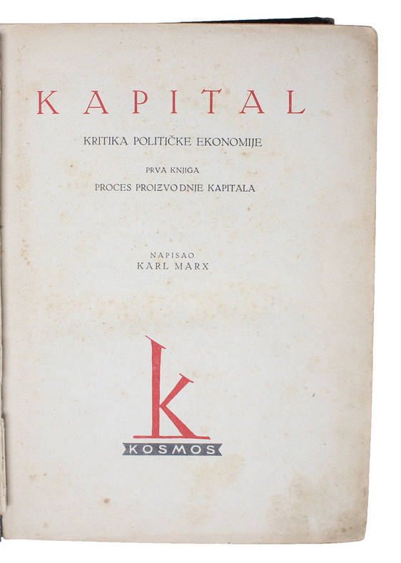 The first Serbo-Croatian translation of Marx' landmark work, constituting what is arguably the greatest revolutionary work of the nineteenth century.Translator Mosa Pijade (1890-1957) is thought to have had a major influence on Marxist ideology as exposed during the old regime in the Kingdom of Yugoslavia. In 1925, he was sentenced to 20 years in prison because of his 'revolutionary activities' after World War I. He was discharged after 14 years in 1939 and imprisoned again in 1941 in the camp Bileca.""In prison he met Rodoljub Colakovic (1900-1983) a member of Crevena Pravda, a group accused of killing interior minister Milorad Draskovic in 1921. Together they translated volume one of ""Das Kapital"" in Serbo-Croatian and published it under the pseudonyms Milovan Porobic and R. Bosanac. The second volume was translated by Mosa Pijade alone."" (karlmarx. lu /Kapitalserb.htm)