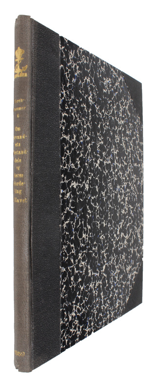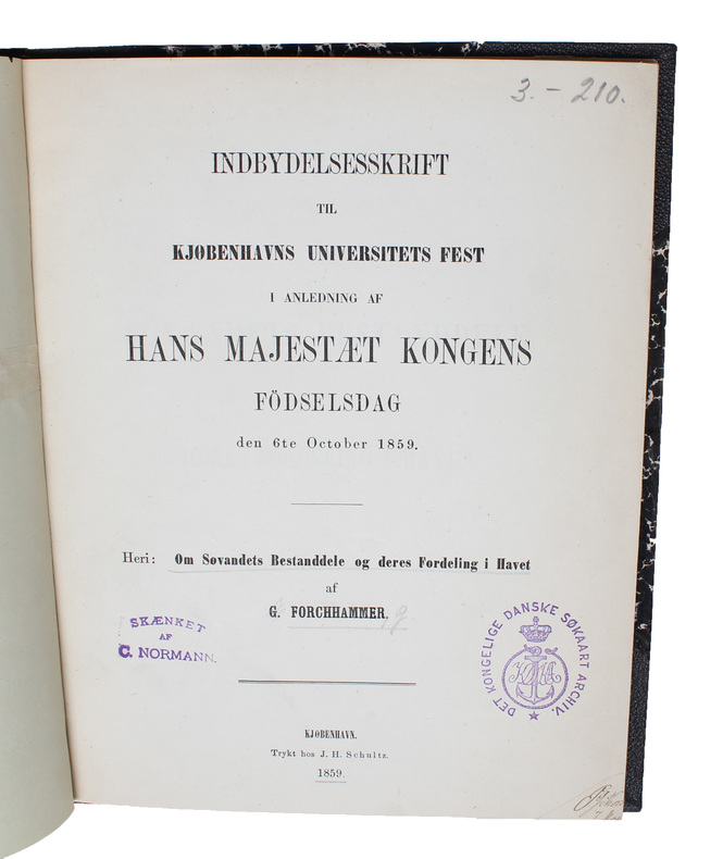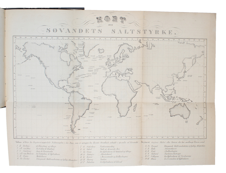 First edition of this pioneer-work in oceanography and hydrography, as it is the first scientific investigation in this field of research. ""Forchhammer's fundamental researches on the composition of seawater brought him international acclaim. He began this work in 1843, more as a geologist than as a chemist, to explain the phenomena that give rise to the deposits on the sea floor...He carried out analyses of over 160 samples collected for him over a twenty-year period by the Danish and British navies."" (DSB V: p. 72). The work was translated into English as ""On the Components of Sea Water"" (1865) in Phil. Transactions.