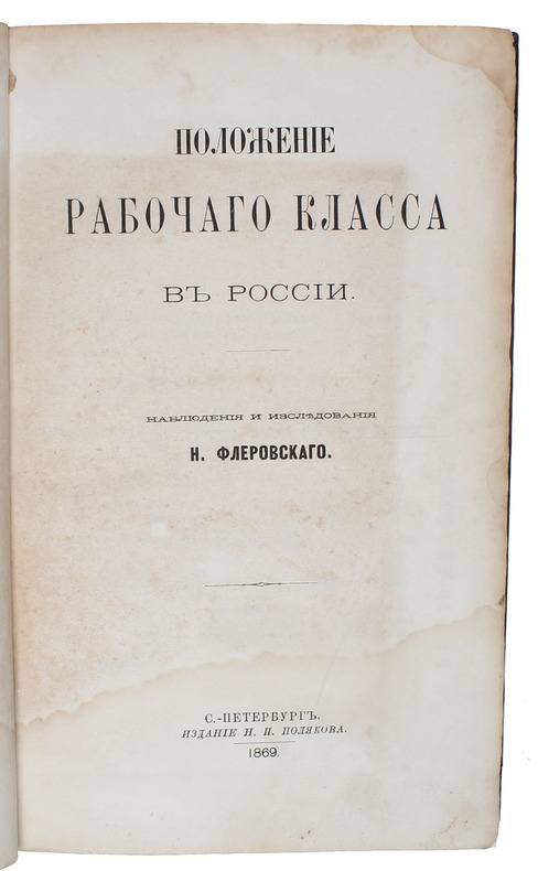 Rare first edition of Bervi-Flerovsky's important study based on his own research and impressions from Siberia, which became a milestone in the history of Russian sociology, often referred to as the Russian 'Das Kapital'. It was greatly appreciated by Marx, and in 1869 he began leaning Russian in order to be able to read this work. Marx came to consider Russia the country in which the outbreak of the Revolution was most likely to happen, and in his research for the successive volumes of 'Das Kapital', he primarily used the present work along with works of A. Hoshelev.Flerovsky painted a vivid picture of the growing destitution of the peasantry following the introduction of capitalist social relations in agriculture. ""the conclusion he drew was that everything possible should be done to prevent capitalism from making further headway and to utilize, instead, the potentialities of the peasant commune."" (Walicki, A History of Russian Thought).""I have read the first 150 pages of Flerovsky's book (they are taken up by Siberia, North Russia and Astrakhan). This is the first work to tell the truth about Russian economic conditions. The man is a determined enemy of what he calls 'Russian optimism.' I never held very rosy views of this communistic Eldorado, but Flerovsky surpasses all expectations. In fact it is wonderful and undoubtedly a sign of change that such a thing could be printed in Petersburg at all [...] In any case this is the most important book which has appeared since your Condition of the Working Class"" (Marx's letter to Engels in Manchester. London, 10 February, 1870.)Marx later stated: ""The work by Flerovskii is a real discovery for Europe. Russian optimism which has been put about on the continent even by so-called revolutionists, has been mercilessly exposed in this work. The virtues of the book are not diminished if I say that it is in several places not fully up to critical standards, from the purely scholarly point of view. This is a work of a serious observer, a dispassionate laborer, and an impartial critic, a powerful artist, etc...""As an open revolutionary the majority of Flerovsky's works were banned in Russia. This present first edition was banned but sold so quickly that it was not possible to destroy the whole run. All 2465 copies of the second edition from 1872 were destroyed.