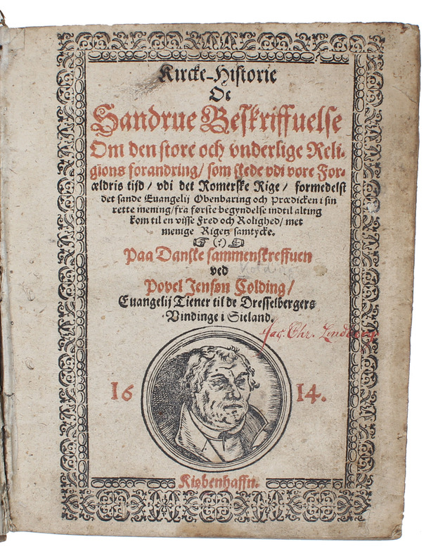 Kiøbenhaffn, 1614. 4to. I samtidigt helpergament. Titelblad trykt i rødt og sort. Med træskåret portræt af Luther på titelbladet. Lille stempel på bagerste blad. Bind med en smule slitage, men ellers pænt eksemplar.