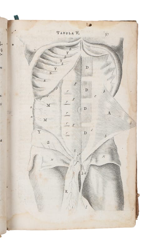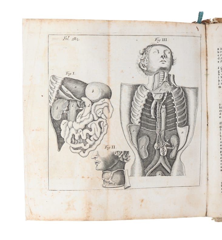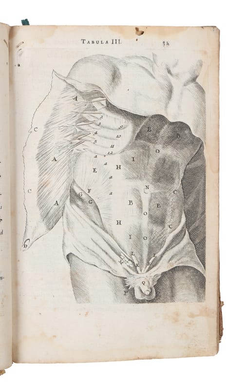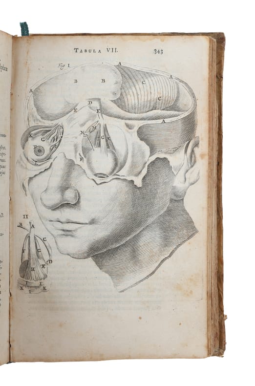 A later, much improved and expanded edition, of Thomas Bartholin's revised edition of his father's classic 'Anatomicae institutiones' (1611). Caspar Bartholins ""Anatomy"" became known all over Europe and greatly influenced the teaching of anatomy in the 17th century.Thomas Bartholin included in this revised edition of Anatomia also two letters (""Epistolae duae de Motu chyli et sanguinis"" - accompanied by 3 plates) on the relation between the lymphatic system and the thoracic duct.Krivatsy 780 Wellcome 11, 107. Waller 714 Choulant-F. 245 Kestner 86.