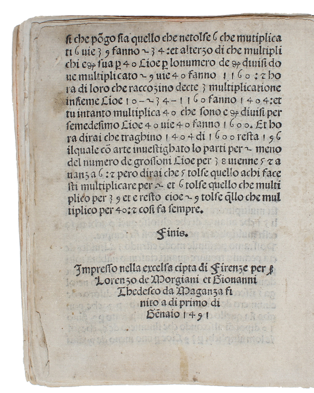 Rare first edition of the first illustrated Italian book on arithmetic, also constituting one of the first inexpensive illustrated textbooks making it available to many more students than earlier teaching materials. The woodcuts, which range from ornamental classicizing borders framing multiplication tables to lively depictions of people and animals that illustrate word problems, are exquisite examples of the flowering of Florentine woodcut illustration in the 1490s.Two variant issues were published simultaneously: One by Lorenzo Morgiani and Giovanni Petri, 1 january 1491/92 and the present by Lorenzo de Morgiani and Giovanni Thedesco da Maganza, 1491. Priority of issue has not been established (Hain, Smith, BM-Ital., De Morgan and Tomash & William quote this variant as the first), but there can be no doubt this present variant by far is the rarest. Calandri here gives the leading rules for integers and for lire, soldi and denari, and likewise puts division down in examples. Calandri is the first to give long divisons in the modern form, known to the Italian writers by the name ""a danda"". ""Indeed Calandri gives only the 'a danda' method, omitting the galley forms, and is therefore fully a century ahead of his time."" (David E. Smith). - In Augustus de Morgan's bibliography: Arithmetical Books from the Invention of Printing to the Present Time, 1847, Calandri's Arithmetic is listed as the first. GW 5884" BMC VI68I BM-Ital 136 Oates 2423 Klebs 236.1 Stillwell 154 Goff C-34 Smith, Rara. Pp. 47-49 Tomash & William C9 Hain 4234. De Morgan p. 1.