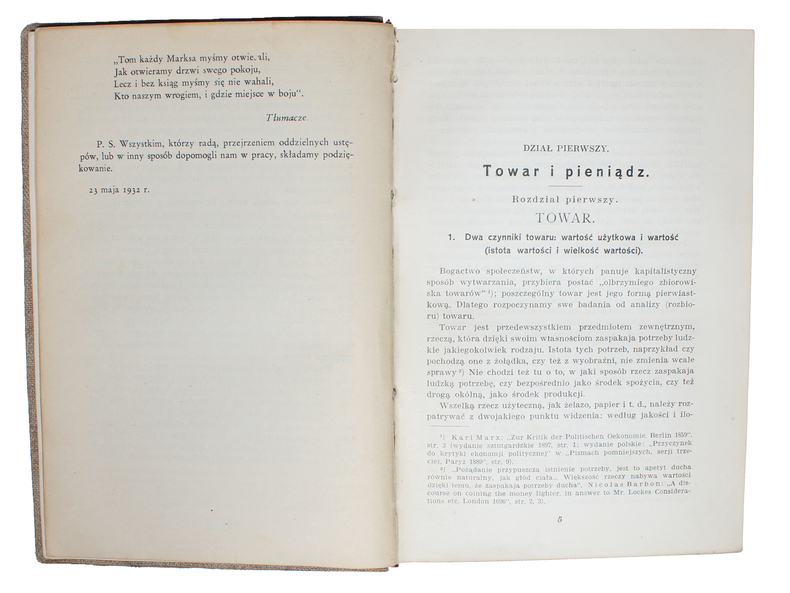 Rare second Polish translation of Marx's Das Kapital. This edition is a new translation by the collective of Henryk Lauer, Ludwik Selen, Mieczyslaw Kwiatkowski, Jerzy Heryng. The planned second volume was never published.OCLC list no copies outside Poland.