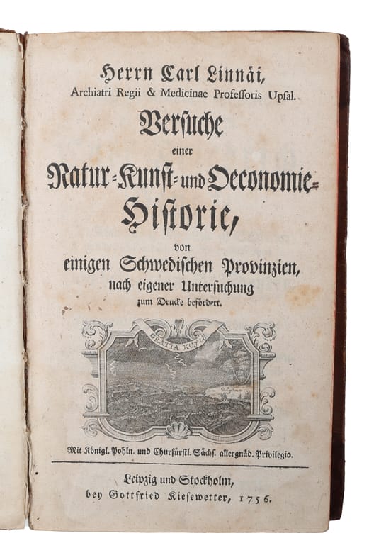 Leipzig und Stockholm, Kiesewetter, 1756. Contemp. full calf. Richly gilt spine. Titlelabel with gilt lettering (partly gone). Spine rubbed. Some leather at lower compartments lacks. (32),336 pp., 2 engraved plates, 1 folded engraved maps. Faint scattered brownspots and occassionally light toning. No halftitle.