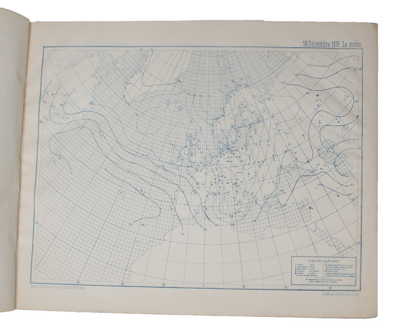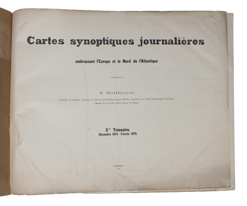 Rare first printing of Meteorologist Niels Hoffmeyer's massive work depicting surface synoptic observations in Europe and the North Atlantic - At the time considered one of the most ambitious meteorological undertakings. ""Starting in 1876, Hoffmeyer began to collect all available observations from the North Atlantic (Iceland, the Faroe Islands, Greenland, and ships) for the three previous years (1873-75), plot them on maps, and analyse them by drawing isobars. These maps were then published annually. Five years later, when the printing of the maps became too expensive for the Danish state, the ""Deutsche Seewarte"" (German Marine Weather Service) in Hamburg took over the work until the first world war. The analyses continued, as before, to be made in Copenhagen. The ""Hoffmeyer maps"" are thus another nice example of European scientific cross-fertilization."" (Niels Hoffmeyer - a great but forgotten Danish meteorologist, EMS)""Unread still are Danish daily weather maps for the NATL listed in a catalogue published by Bibliothek der Deutchen Seewarte (1890). These maps were also a joint effort between the Danish Meteorological Institute and Deutsche Seewarte and depict the weather at 0800 local time for ships at sea. The maps were published from 1876 to 1880 and run from September 1873 to November 1876. The series is entitled ""Cartes synoptiques journalières embrassant l'Europe et le Nord de l'Atlantique "" and authored by Hoffmeyer. Contact with Danish Meteoroloigcal Institute confirmed that the maps have been moved to the Danish State Archive"" (Chenoweth, New Compilation of North Atlantic Tropical Cyclones, 1851-98)