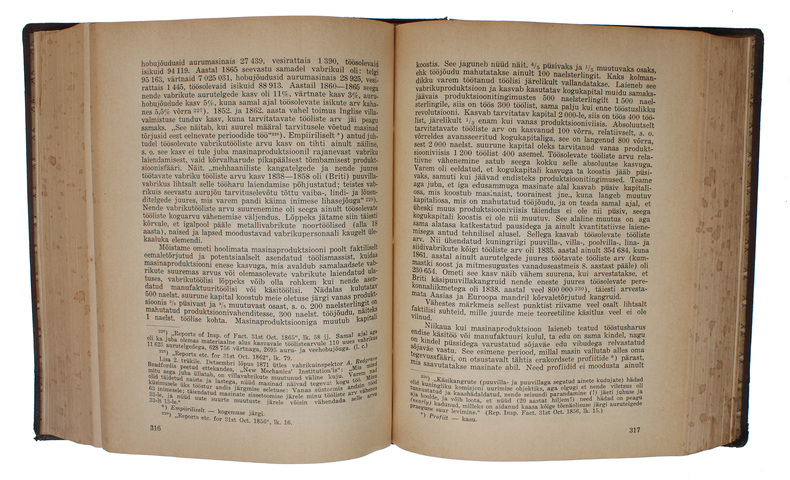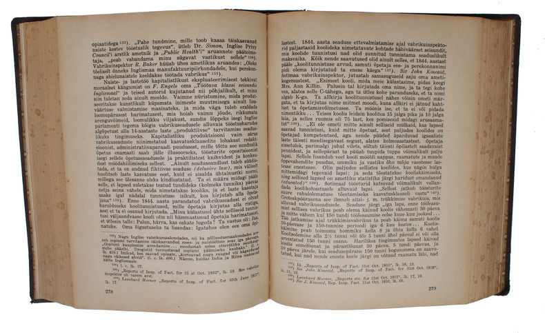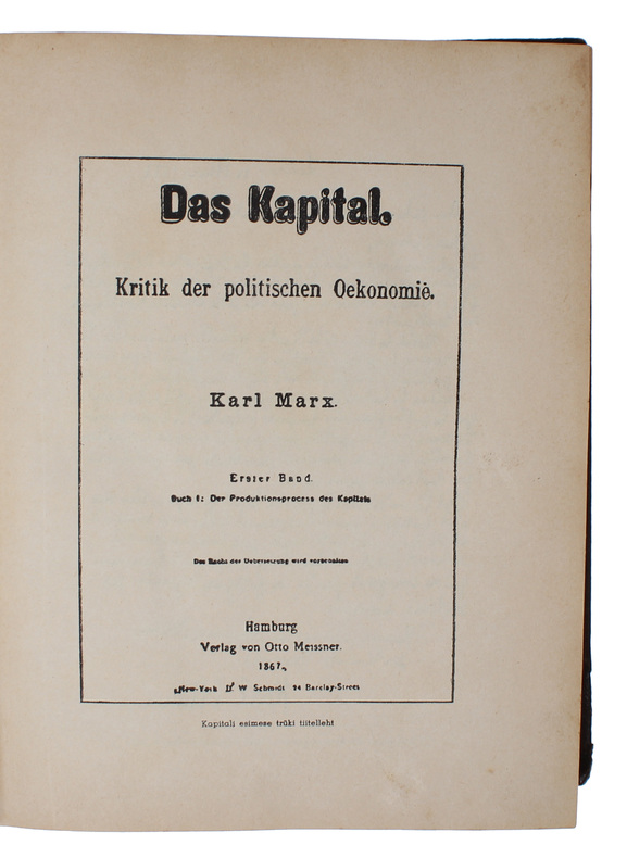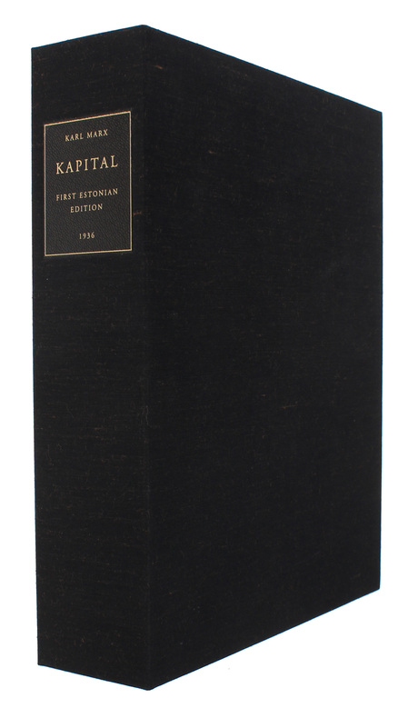 The rare first complete Estonian translation of Karl Marx's 'Das Kapital'. The comparatively late translation was due to the fact that German was Estonia’s official language and the language of grammar school and higher education prior to 1918/1920. It was replaced by Russian starting in the 1890s. Translator Nigol Andresen (1899-1985) worked as a teatcher at various Estonian High Schools from 1918 to 1932. In 1932 he was dismissed for political reasons because of his membership in the Estonian Social Democratic Labor Part. In the same year he was elected to the Estonian Parliament, to which he formally belonged until 1937. In 1934 Andresen was expelled because of his contacts with the Communist Party from the Social Democratic Labor Party. He was then union secretary and became, after the Sovietization in 1940, a proponent of the new communist system. In a short period under the Vares Cabinet he functioned as foreign minister.At the outbreak of the German-Soviet War in 1941 he went to the Soviet Union and lived in Moscow. After returning to Estonia, he was from 1946 to 1949 Member of the Supreme Soviet of the Estonian Soviet Socialist Republic. However, at the infamous eighth plenum of the Estonian Communist Party of March 1950 he fell out of favor and was imprisoned. Only in 1955 he was released from custody.