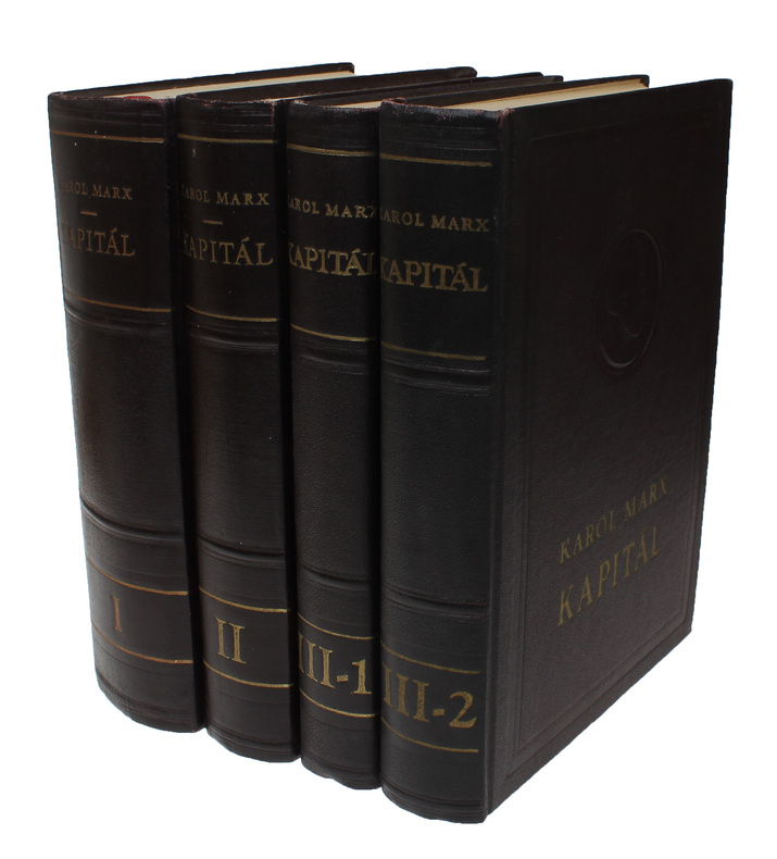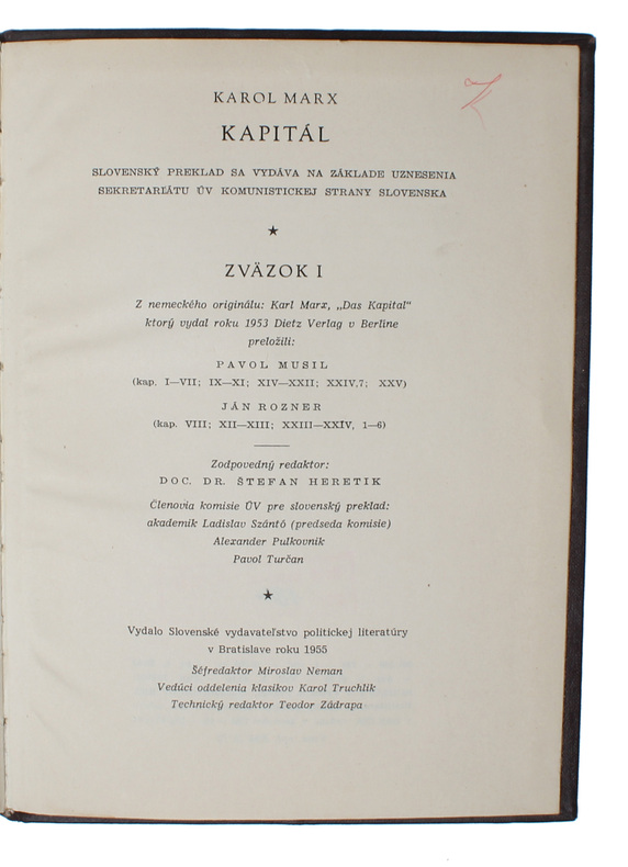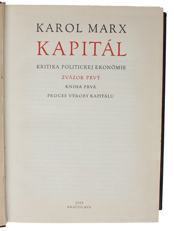 Rare first Slovakian translation of Marx’ landmark work ‘Das Kapital’. A Czech translation was made in 1913 which, due to similarities between the languages, for a while made a Slovakian translation superfluous. Because of the dominance from the Soviet a need for a Slovak translation rose and a complete transition of all three volumes were published between 1955 and 1958. In the Czech lands and Slovakia the study of economics developed later than in the West European countries. An urgent need for economic study arose only in the 19th century, when the disintegration of feudal relations and the development of capitalism, were accompanied by a national revival. Marxist economic theory was somewhat slow to gain a following in the Czech lands and Slovakia.