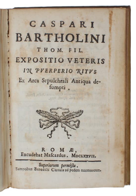 Rome, Pauli Monetæ, 1677. 8vo. In contemporary full vellum with title in contemporary hand to spine. Light wear to extremities and hindges a bit weak.Small stamp to title-page and previous owner's names to upper part of title-page. Vague waterstain to lower outer corner of last leaves. A good copy. (14), 235, (5), 63, (3) pp. + three plates and frontiespiece.