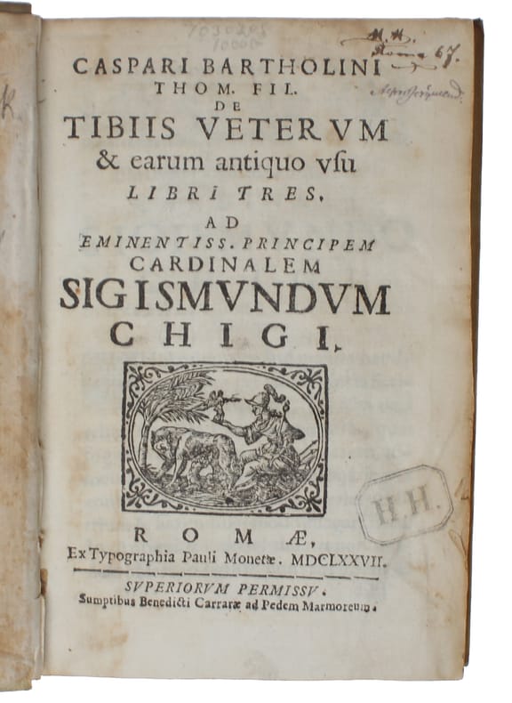First edition of Bartholin's rare work on ancient flutes and horns.