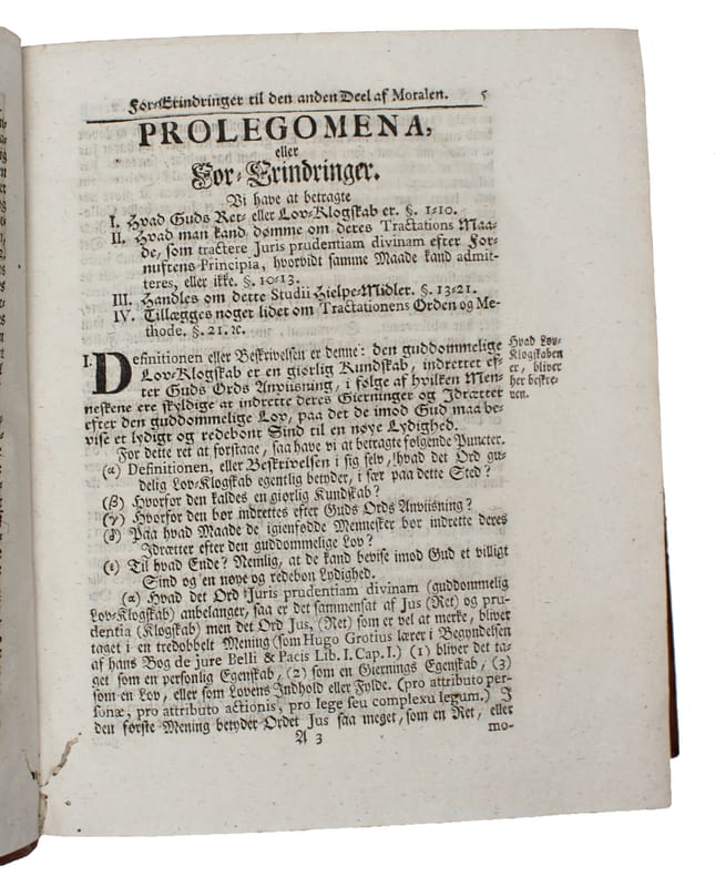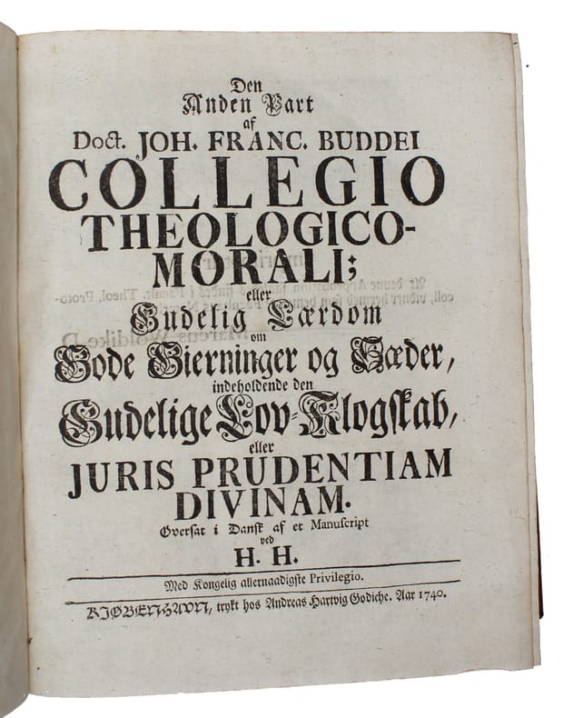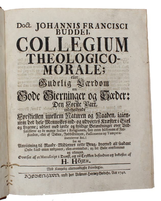 Rare first Danish translation of Buddeus's ""Institutiones theologiae moralis"" (1711) which in many aspects inaurated a new age of moral sensitivity among Lutherans of which Pietism became the most important theological tradition. Johann Franz Buddeus (1667-1729) born in Pomerania, was professor of Greek and Latin, moral philosophy and theology at Leipzig and Halle.