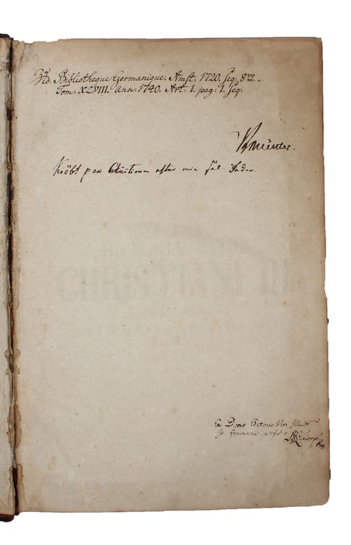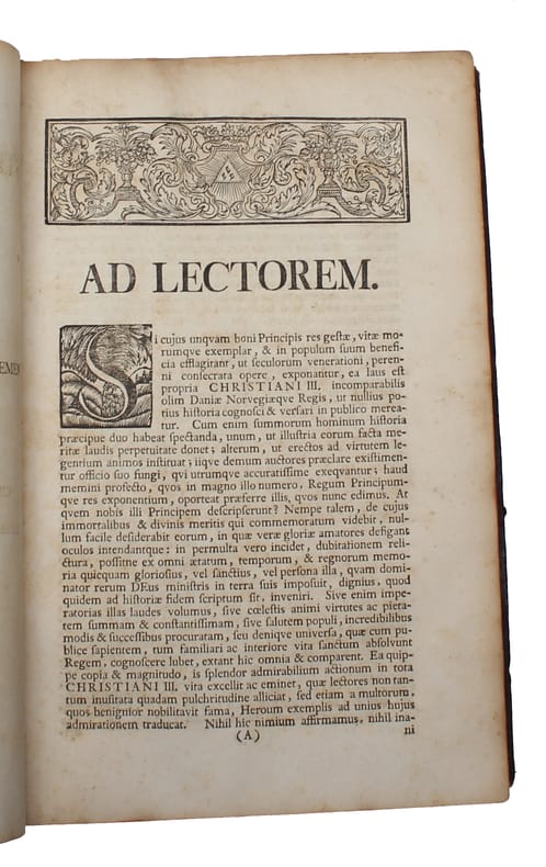 Hafniæ, Paulli, 1737. Folio. Contemporary full mottled calf with Luxdorph's blindstamped super ex libris to front board. Six raised bands to richly gilt spine. Spine and all extremities worn. A bit of leather missing at capitals, and cords showing at hinges. Even though the hinges are worn, the binding is still tight. Internally very nice and fresh with only very light occasional brownspotting. Front free end-paper with three annotations: 1) from the ""Bibliotheque Germanique. Amst. 1720""" 2: Frederik Münter (noting that it was bought at the auction after his father) 3: Ex Dono-inscription by Luxdorph (perhaps the most important Danish book collector of all times), stating that the book was given him by Johannes Gram (the editor). (42 - including half-title and frontispiece portrait (which is often lacking) ), 139, (1), 478, 136, (36) pp.
