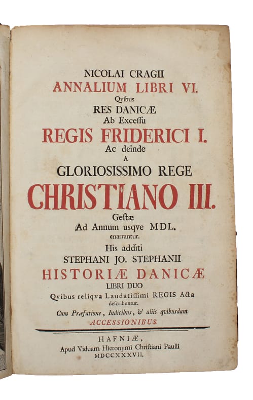 First edition, with an truly excellent provenance, of this important work of the history of Denmark, which due to Krag's untimely death only spans the first 16 years of the history of King Christian III. When Krag, the first official Danish historiographer, died in 1602, Krag had been working on the work throughout the 1590’ies. The manuscript was not finished and ended up remining unpublished for more than a century, until Hans Gram finally, in 1737, arranged for a beautiful edition of it to be printed. This wonderful first edition also contains other contributions to the history of King Christin III. Krag’s work is important in several ways. First of all, it focuses mainly on Danmark’s foreign relations during the period, making it an invaluable contribution to the history of Denmark’s international history of the late 16th century. Second, the work is both politically and linguistically important in its choice of Latin as the authorial language. It is written in an excellent classicist Latin that was to mark Denmark as part of the united European cultural sphere in short, it was meant to represent Danmark as belonging to the civilized world. Krag’s excellent, stylized Latin history of Christian III constitutes the best example of applying classical historiography stylistically to the history of Denmark. The work is Roman in all its aspects. The vocabulary and the syntax are in accordance with classical Roman norms, and Krag also adopts the principle of the Roman historians of never quoting other text. The prose is his own all the way through. Also in his choice of relating the diplomatic relations of the King and the country, he stays true to the classical authors. Another noteworthy feature of this novel historical work is the fact that all Danish proper names are Latinized, not only cities, but also people (eg. the Danish nobleman Eske Bilde has been given the name Aeschylus). Crag took this so far that Hans Gram found it necessary to make an explanatory list of Crag’s Latinizations. ____________________________________________________________________________________ Provenance: The copy was given by the editor and publisher Johannes Gram to his student Bolle Luxdorph (1716-1788). Luxdorph was a famous Danish historian, poet, and state official. In bibliophile circles, however, he is most known as a book collector – one of the most important in the history of Danish book collecting. Bindings with his super ex libris (an elephant) are very sought after. Luxdorph was matriculated at the University of Copenhagen 1733 and had Hans Gram as private preceptor. He studied both theology, philosophy, classical philology, and history. Frederik Münter (1761-1830) was a famous Danish church historian, archaeologist, and Bishop of Sealand from 1808 till his death.