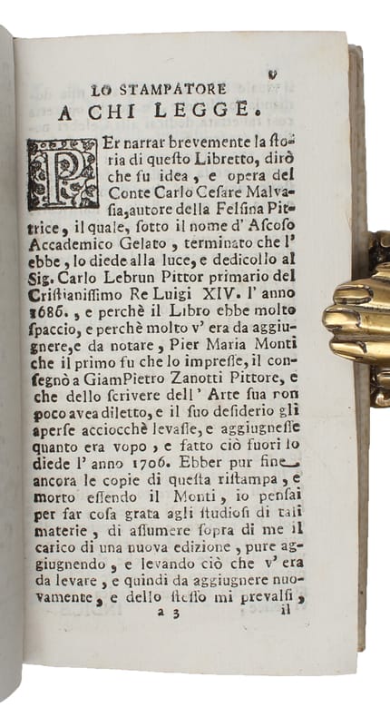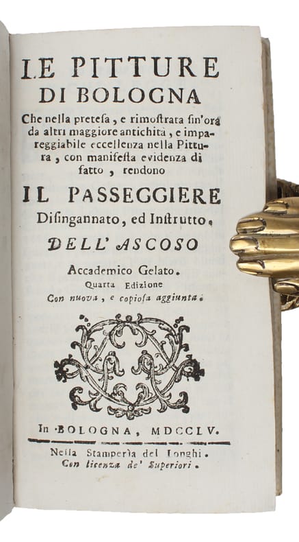 Fourth edition of this classic guide book to Bologna and its art, first published in 1686. It quickly bcame popular and it was reprinted several times, last time in 1776.