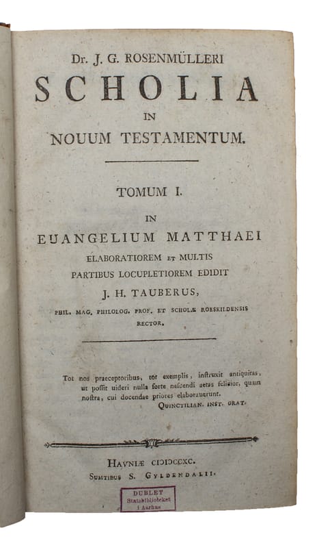 Rare first edition of Rosenmüller’s extensive commentary on the New Testament Johann Georg Rosenmüller (1771–1829) was a German Protestant theologian primarily known for his contributions to biblical scholarship and oriental studies. Rosenmüller made significant contributions to the field of exegesis. From 1785 he was professor of theology in Leipzig where he established a modern Lutheran liturgy
