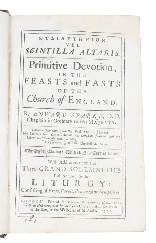 Eighth edition of Spark’s most popular and influtial work being a series of disquisitions or meditations on the principal feasts, together with original religious poetry in each section and extensive prayers for each feast. The engraved illustrations derived from engravings by Collaert after Marten de Vos. Despite its popularity and numerous edition and reprints, all editions are scarce and are rarely found in the trade.