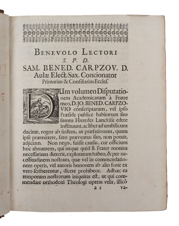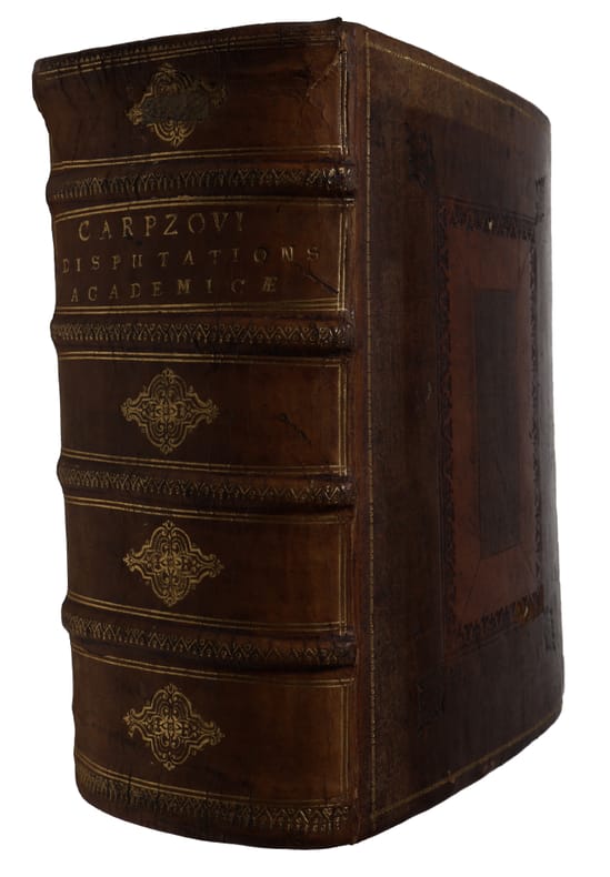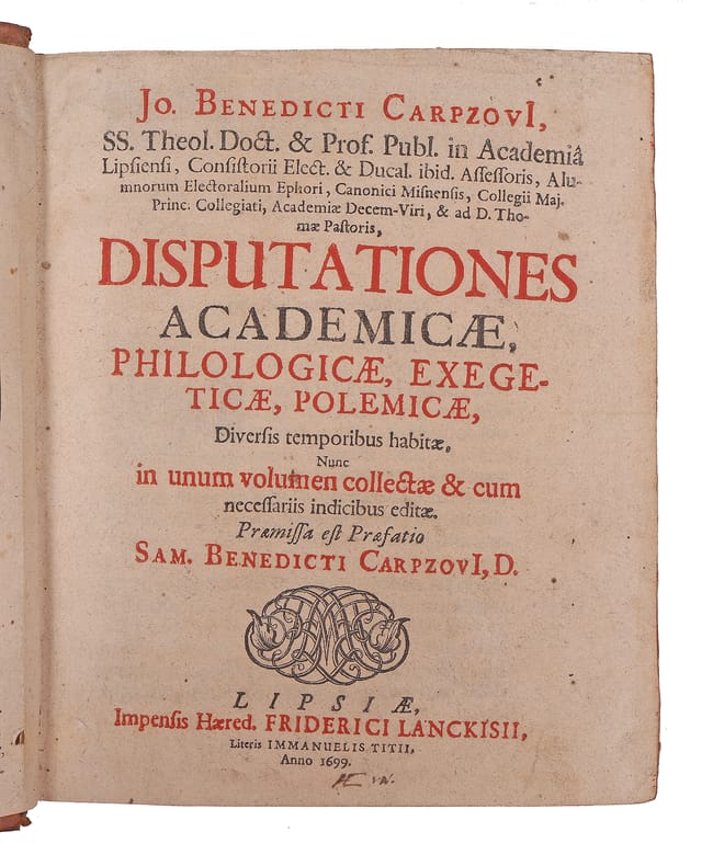 The rare first edition of this collection of dissertation by Johann Carpzov published by his brother Samuel Carpzov. Johann Benedict Carpzov II (1639–1699) was a prominent German Lutheran theologian from Leipzig. A key figure in Lutheran orthodoxy he studied and taught theology at the University of Leipzig, defending traditional Lutheran doctrine against Calvinism and other emerging theological movements.