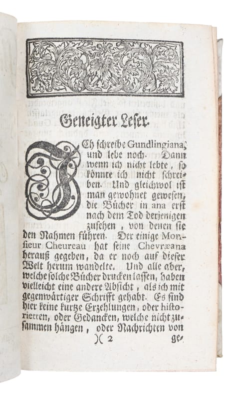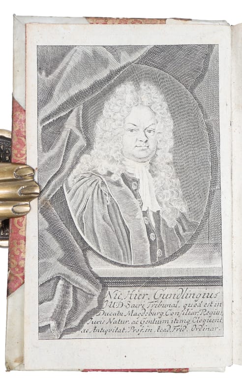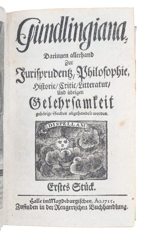 First 40 issues out of a total of 45 of the first edition of one of the earliest German-language scholarly journals, edited by Gundling himself up. Nicolaus Hieronymus Gundling (1671–1729) was a German jurist and philosopher, born in Kirchensittenbach and died in Magdeburg. Nicolaus studied at several universities and became a professor of philosophy in Halle in 1705. He notably debated Gotthard Heidegger in 1702 over the cultural influence of French novels.