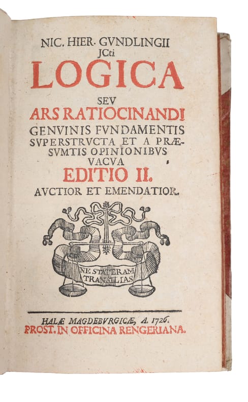 The exceedingly rare first edition of these two works on logic and ethics. Here he delves into the principles and techniques of logical reasoning and explores the structure of argumentation. The second work is focused on moral philosophy addressing fundamental ethical questions about right and wrong, human duties, virtues and the principles that govern moral behavior Nicolaus Hieronymus Gundling (1671–1729) was a German jurist and philosopher, born in Kirchensittenbach and died in Magdeburg. Nicolaus studied at several universities and became a professor of philosophy in Halle in 1705. He notably debated Gotthard Heidegger in 1702 over the cultural influence of French novels.