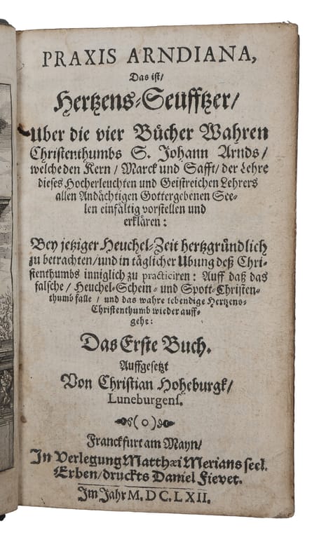 Third edition of Hohburg’s commentary on Johann Arndt’s Wahres Christentum (i.e. True Christianity).All edition are scarce and are rarely found in the trade.