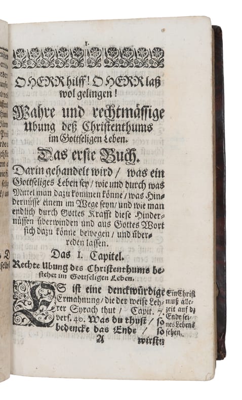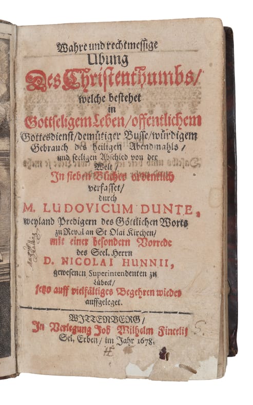 Uncommon devotional work outlining the principles and practices of a pious Christian life. Organized into seven books it provides a structured guide for believers to live according to Christian teachings. Ludwig Dunte (1597–1639) was a German Lutheran scholar, preacher and author from Reval. He served as a tutor, mastering English and French before becoming a deacon at St. Olai.