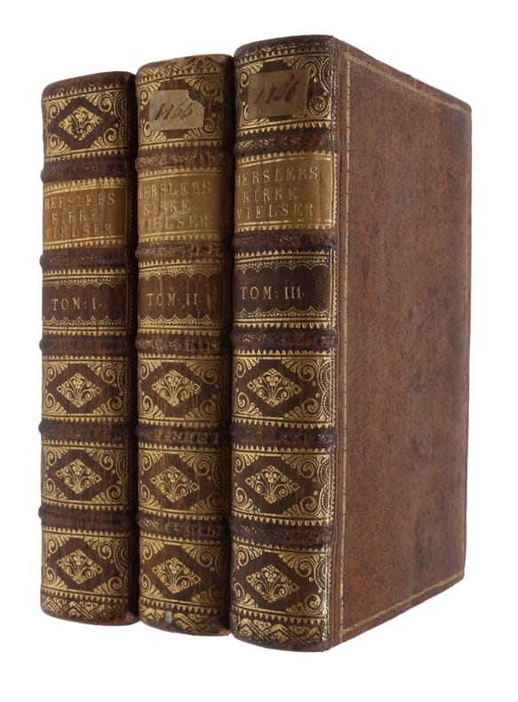 Kjøbenhavn, Jacob Preusses, 1740 - 1746. 8vo. Uniformly bound in three nice contemporary full calf bindings with five raised bands an richly gilt spines. Small paper-label pasted on to upper part of spine. Ex-libris (Juel of Valdemar's Castle) pasted on to pasted down front end-paper. A nice and clean set. (4), 636, (4) pp. (4), 560 pp. (10), 548 pp.