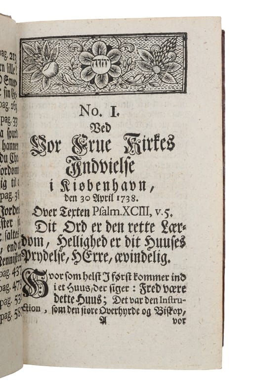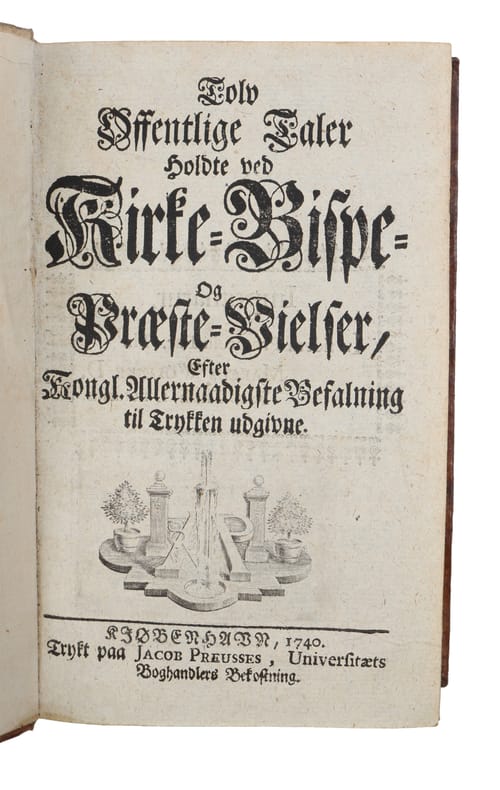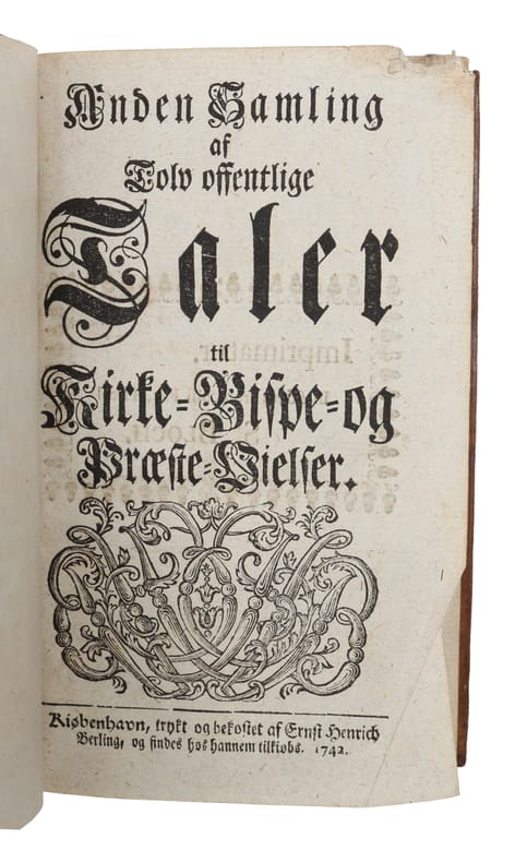 Uncommon first edition of the first three parts of Bishop Hersleb's ceremonial speeches delivered at religious ordinations in Denmark or Norway. Peder Hersleb (1689–1757) was a prominent Danish-Norwegian bishop and reformer. Born in Stod, Norway, to a family with deep roots in the Lutheran Church he was educated in Trondheim and Copenhagen earning recognition for his theological and rhetorical skills. He became a military chaplain in Holstein and later served as court preacher to King Frederick IV. In 1730 he was appointed bishop of Akershus in Norway, where he introduced significant reforms including better catechism instruction, confirmation practices and church governance.