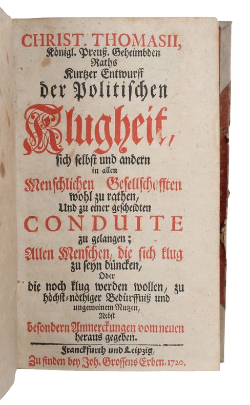 Later edition of this treatise on how to navigate in politics wisely. Christian Thomasius (1655–1728) was a German philosopher and jurist often regarded as one of the most important figures of the early German Enlightenment. Thomasius played a significant role in advocating for a separation between theology and law arguing that legal matters should be based on reason rather than religious doctrine. He taught at the University of Leipzig and later at the University of Halle, where he became the first professor of natural law and the rector of the university.