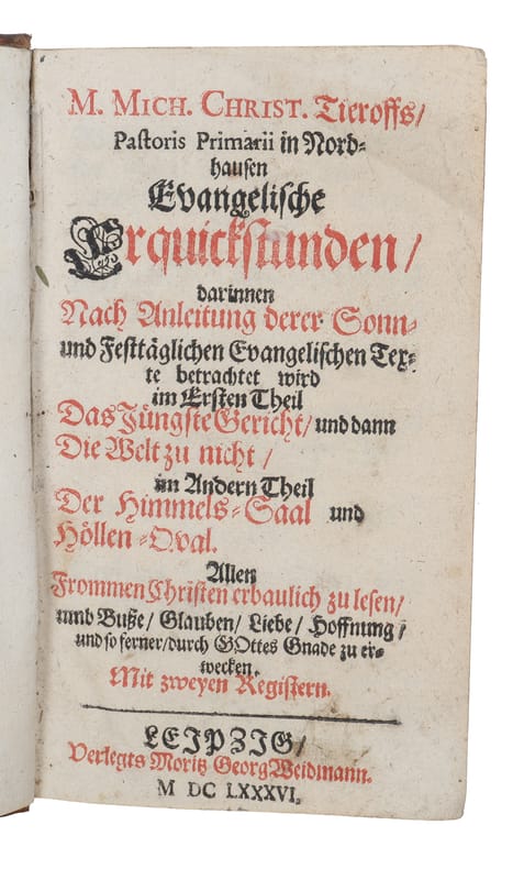 Rare first edition of this theological work Tieroff. Michael Christian Tieroff (1631–1682), who studied in Jena from 1649, was appointed tutor at Friedenstein Castle in Gotha in 1657, and served as a professor at the local gymnasium from 1658 to 1659. OCLC only list three copies (two in Sweden, one in Germany). We have not been able to trace a single copy in the trade.