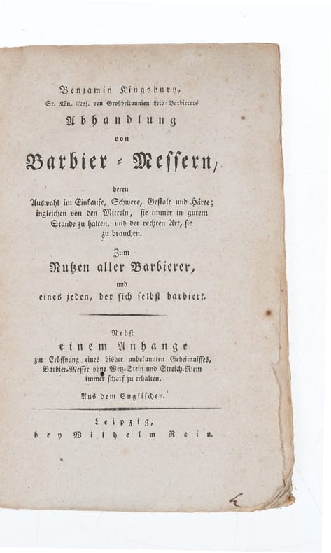 First German translation of Kingsbury popular work on razors originally published in English in London in 1797. Here Kingsbury describes both the exact characteristics of a high-quality razor and the necessary steps for its proper care. He also instructs the reader in the correct use of razors when shaving themselves. ""Probably the only work on the subject ever written, from the date of the flint-rasps of the Stone Age to that of the latest American contrivance for those who cannot hold a razor"" (Sotheran, Bibliotheca Chemico-mathematica 10149).