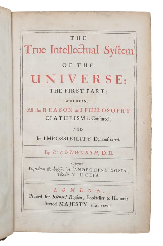 First edition of Cudworth’s only work of philosophy to be published in his lifetime – arguably one of the most ambitious and intellectually ambitious philosophical works of the 17th century. Here Cudworth sought to unite classical philosophy with Christian theology while offering a systematic refutation of atheism and materialism. His work had a significant impact on early modern philosophy shaping discussions on metaphysics, theology and the nature of divine providence. “(The present work) as published in 1678 is only the first of three volumes which Cudworth had planned to write with the same over-all title, but he defends it as a self-standing work. In it he seeks to provide an anti-determinist defence of theism against scepticism, atheism and materialism, and to demonstrate the compatibility of true philosophy with true religion. In so arguing, he probably had in mind the anti-atheist arguments of book X of Plato’s Laws. The last chapter, in particular, contains many, often extensive, arguments with his philosophical contemporaries (Descartes, Hobbes and Spinoza).” (SEP) “Arguably it constitutes the most important statement of innate-idea epistemology by any British philosopher of the seventeenth century …. The full extent of Cudworth’s legacy in philosophy has yet to be mapped out. In England John Ray, John Locke (his critique of innate ideas notwithstanding), the third Earl of Shaftesbury, Sir Andrew (Le Chevalier) Ramsay, Richard Price and Thomas Reid all acknowledge their debt to Cudworth. In the European Enlightenment, Cudworth was the focal point of a dispute between Bayle and Le Clerc in 1703–1706. His concept of Plastic Nature was taken seriously in France as late as the nineteenth century. Thanks to J.L. Mosheim’s Latin translation (1733) Cudworth’s writings were mediated to the German Enlightenment’ (Sarah Hutton, Dictionary of Seventeenth-Century British Philosophers, Thoemmes Press, 2000). ""The True Intellectual System is primarily a critique of what Cudworth took to be the two principal forms of atheism — materialism and hylozoism [a term coined by Cudworth for the doctrine that all matter is in some sense alive]. The materialist Cudworth had especially in mind is Thomas Hobbes. Cudworth attempts to show that Hobbes had revived the doctrines of Protagoras and is therefore subject to the criticisms which Plato had deployed against Protagoras the Theaetetus. On the side of hylozoism Strato is the official target. However, Cudworth’s Dutch friends had certainly reported to him the views which Spinoza was circulating in manuscript. Cudworth remarks in his Preface that he would have ignored hylozoism had he not been aware that a new version of it would shortly be published"" (John Passmore, Encyclopedia of Philosophy).
